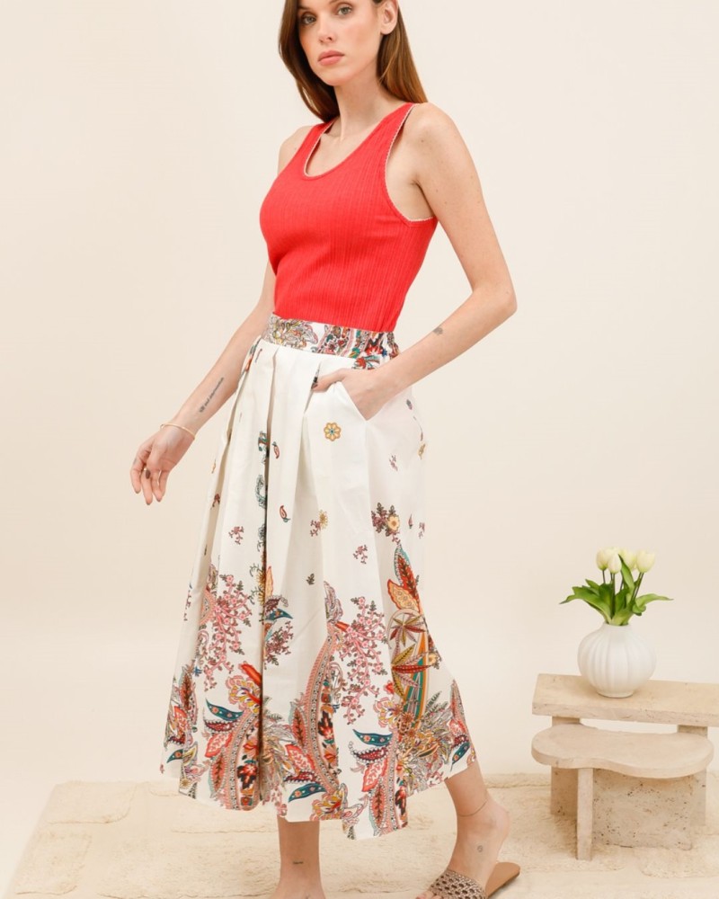 Sa coupe midi évasée sublime la silhouette tout en offrant une grande liberté de mouvement. Dotée d’une taille élastique confortable, elle s’adapte parfaitement à votre morphologie pour un porté agréable au quotidien. Son tissu léger en fait une alliée idéale pour les beaux jours.