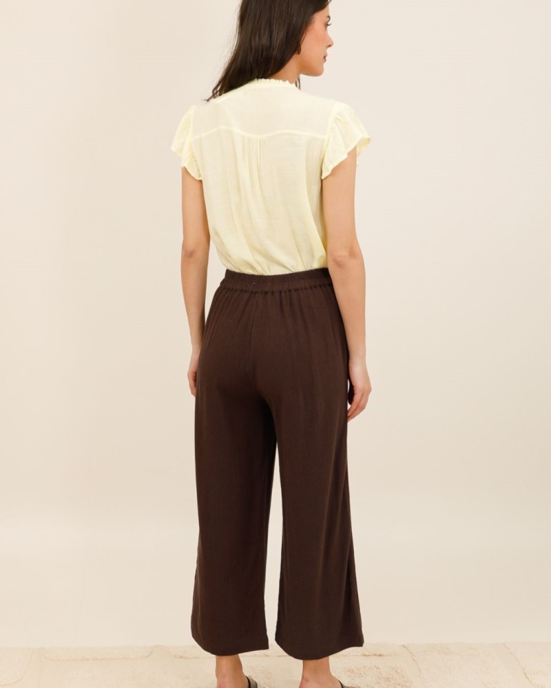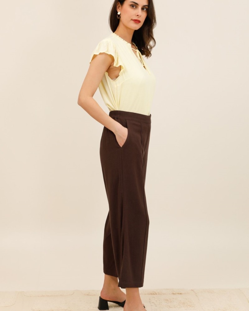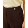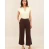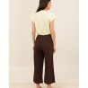 Le Julie pantalon séduit par sa coupe fluide et sa teinte chocolat profonde, parfaite pour une allure élégante et moderne. Sa silhouette légèrement évasée et sa taille haute structurée mettent en valeur la ligne tout en offrant un confort absolu.