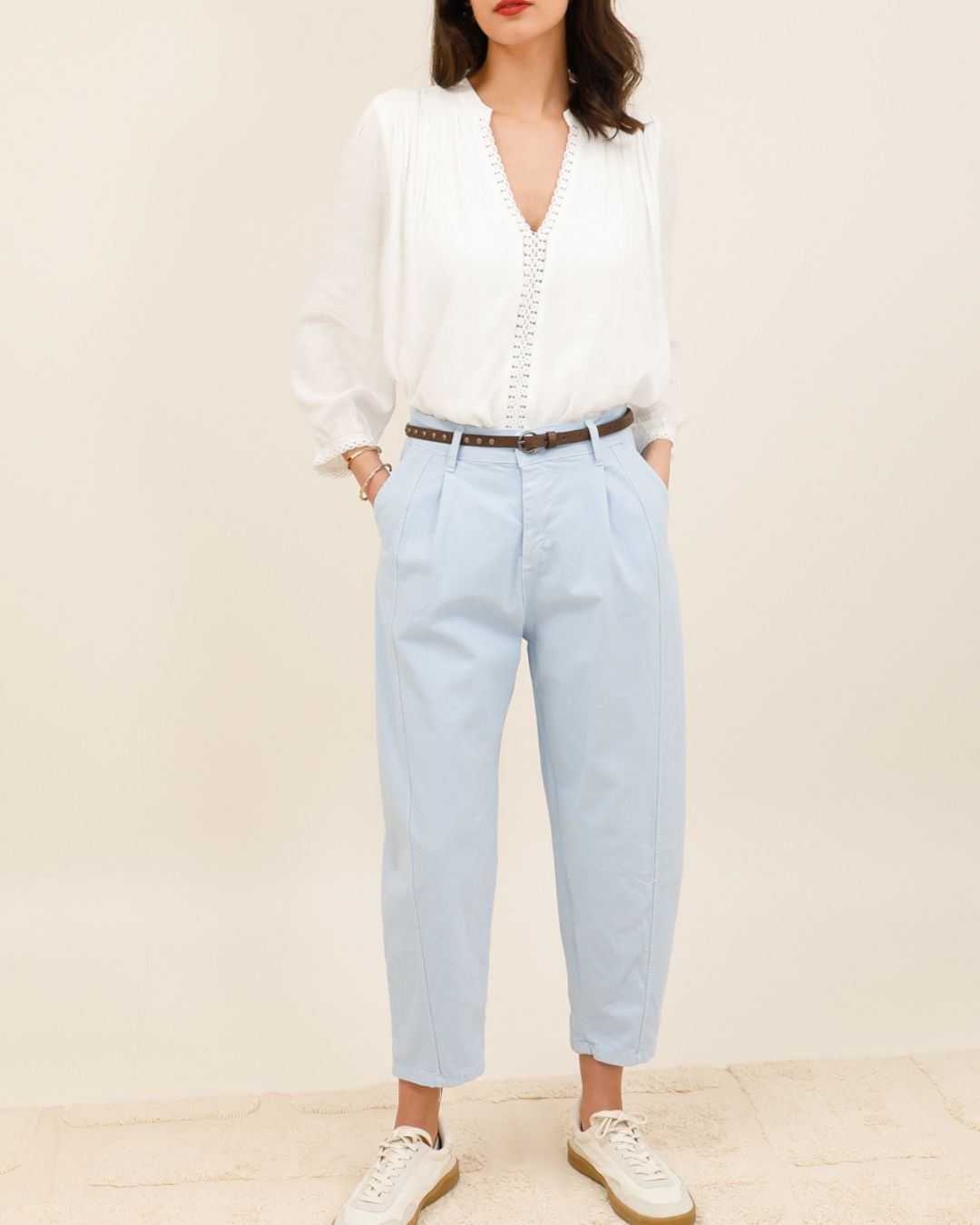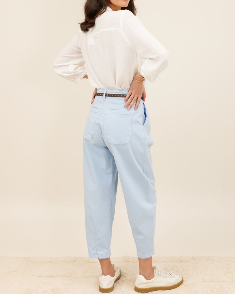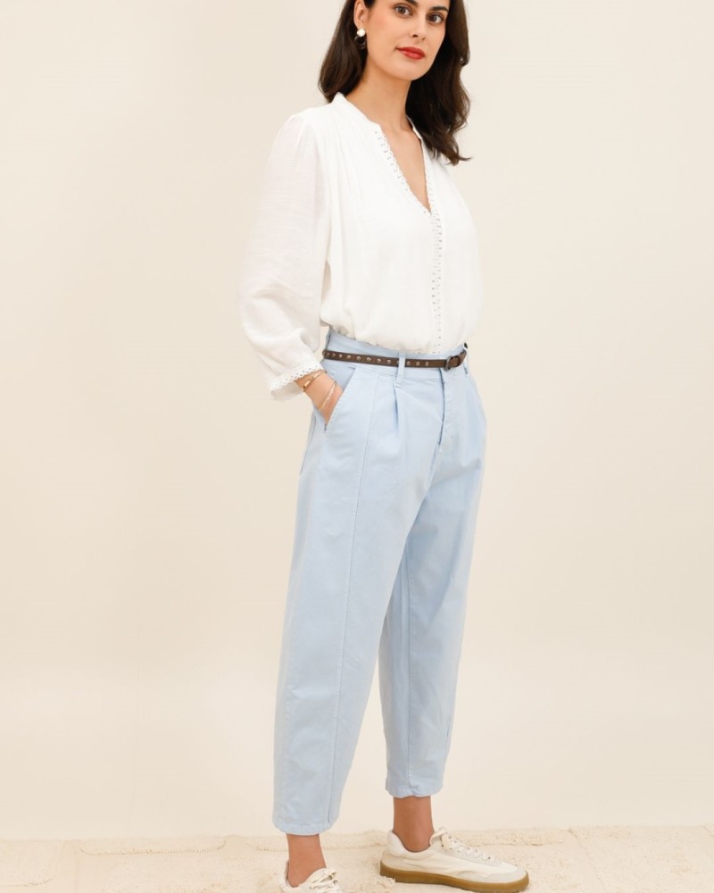 Le pantalon Mila est la pièce idéale pour un look à la fois décontracté et structuré. Avec sa coupe légèrement fuselée et sa longueur 7/8, il apporte une touche contemporaine à toutes vos tenues.