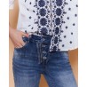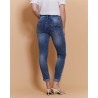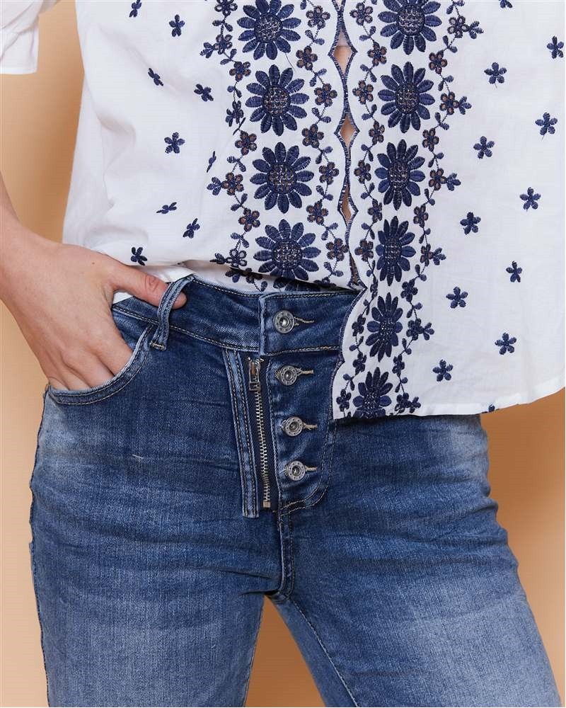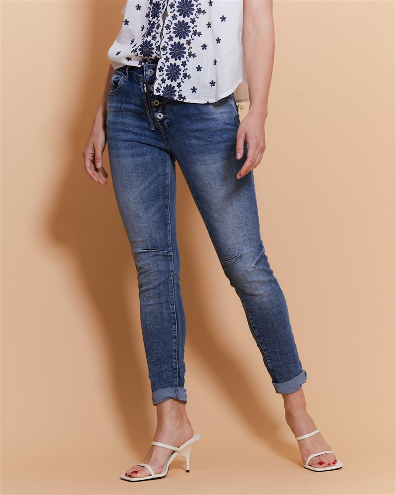 Coupe slim Taille standard Denim bleu délavé Fermeture boutons + zip apparents Matière stretch confortable Poches avant et arrière (détail zip au dos) Bas de jambe retroussable