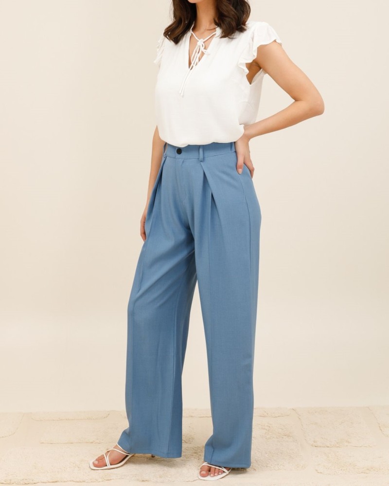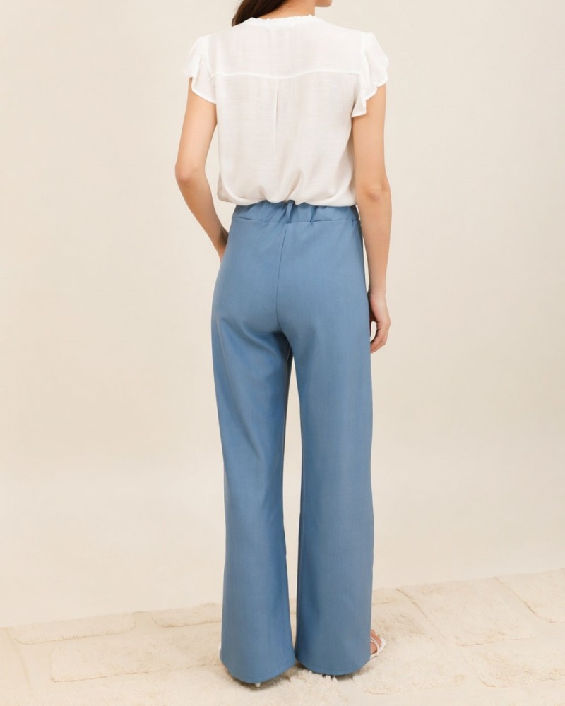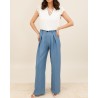 Doté de plis à l’avant, il structure la silhouette avec subtilité et apporte une touche sophistiquée. Sa taille haute flatte la ligne, tandis que sa matière souple assure un tombé impeccable.