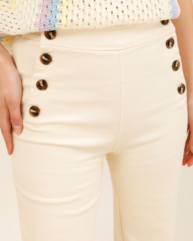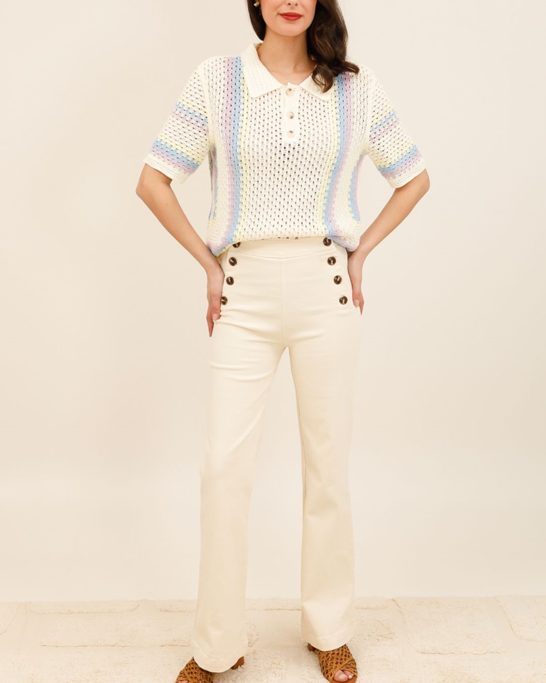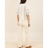 Le Tania Pantalon incarne un style chic et intemporel avec une inspiration subtilement marine. Sa taille haute et sa coupe légèrement évasée allongent la silhouette tout en offrant un confort optimal.