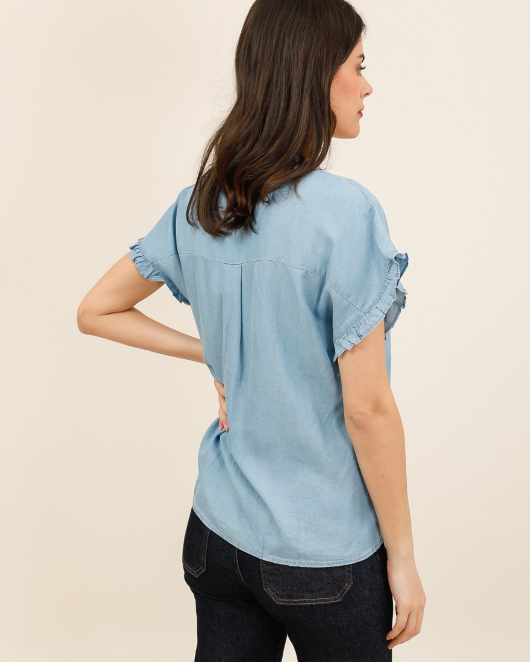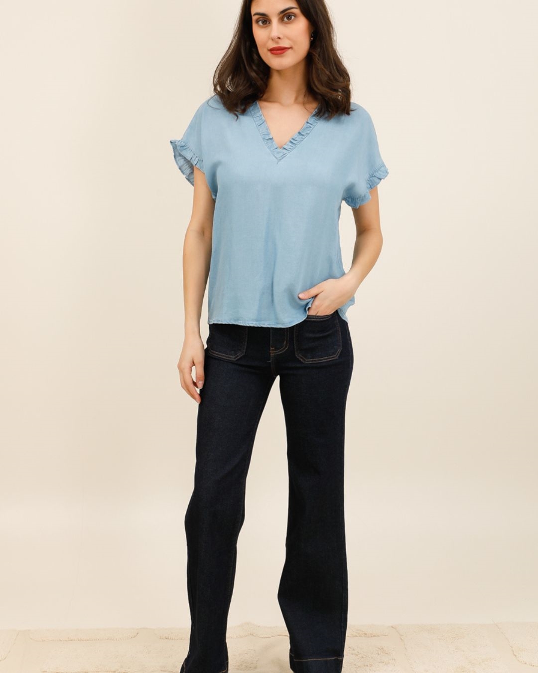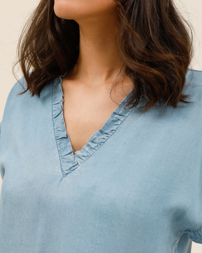 Son col en V délicatement orné de petits volants apporte une touche romantique et raffinée, tandis que les manches courtes légèrement volantées ajoutent du mouvement et de la douceur à la silhouette.