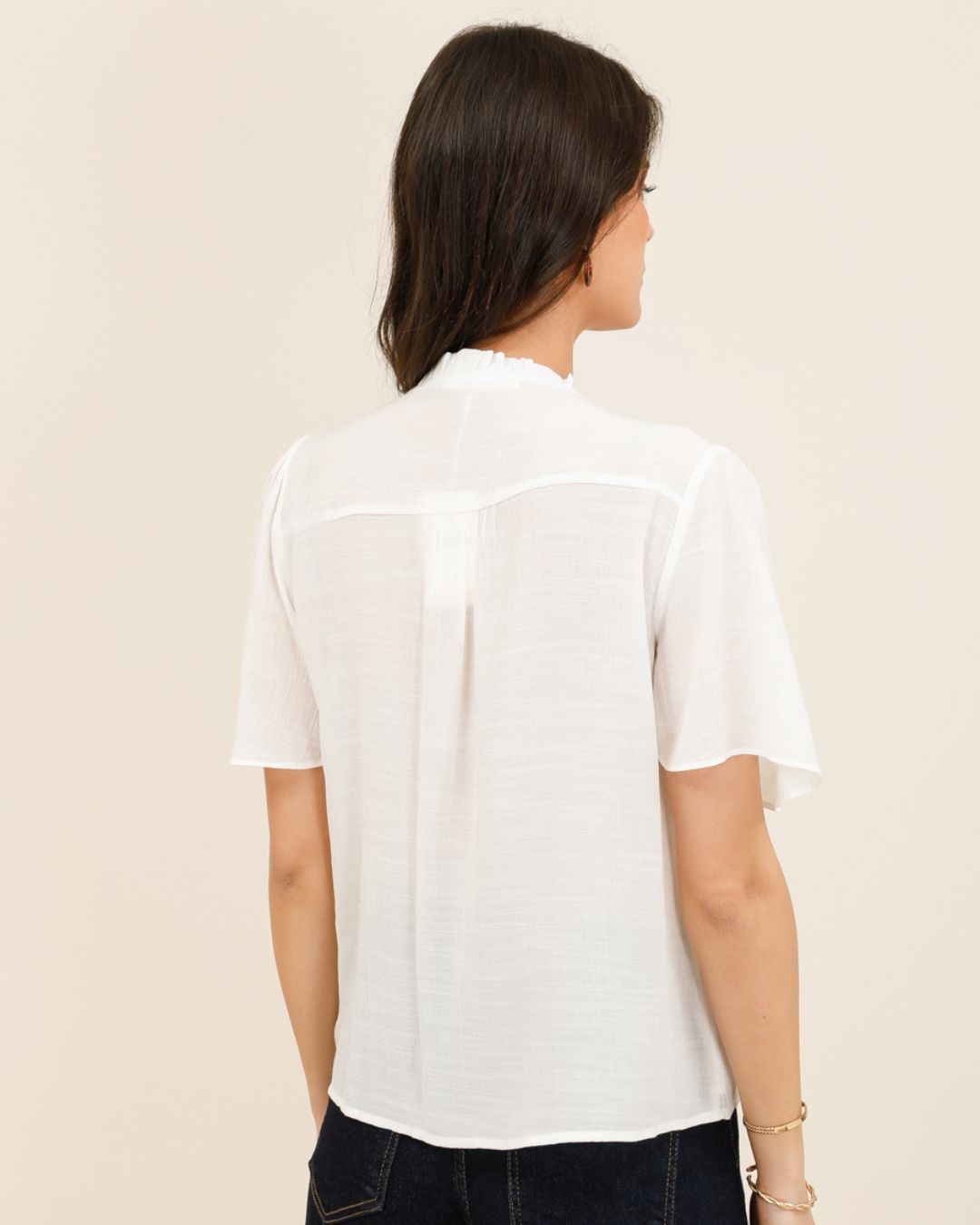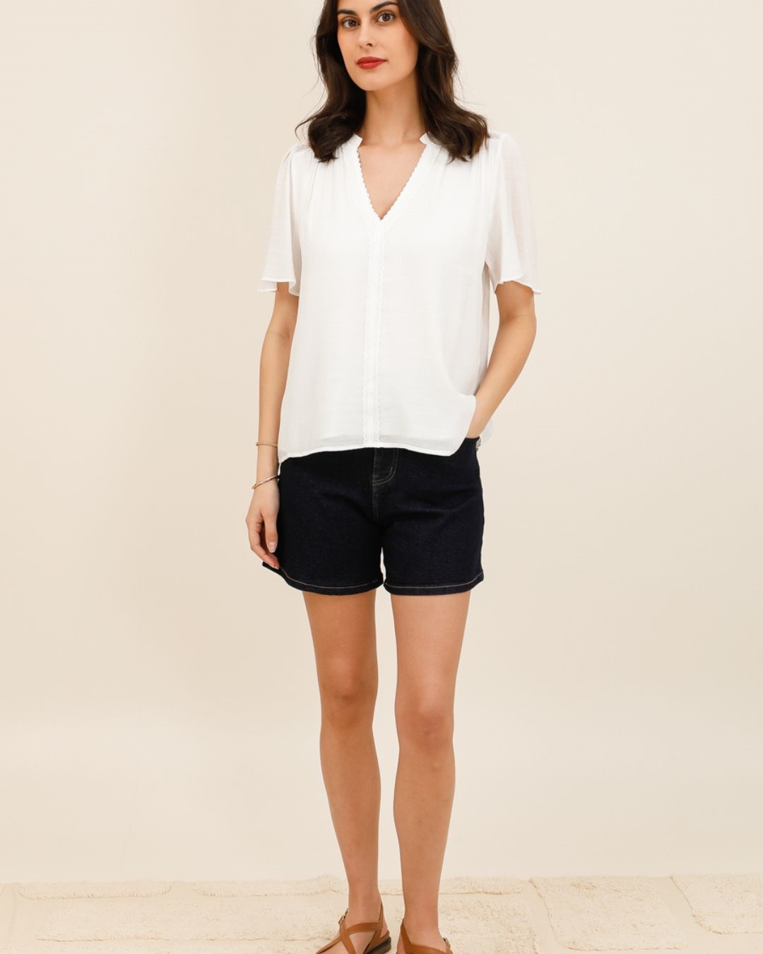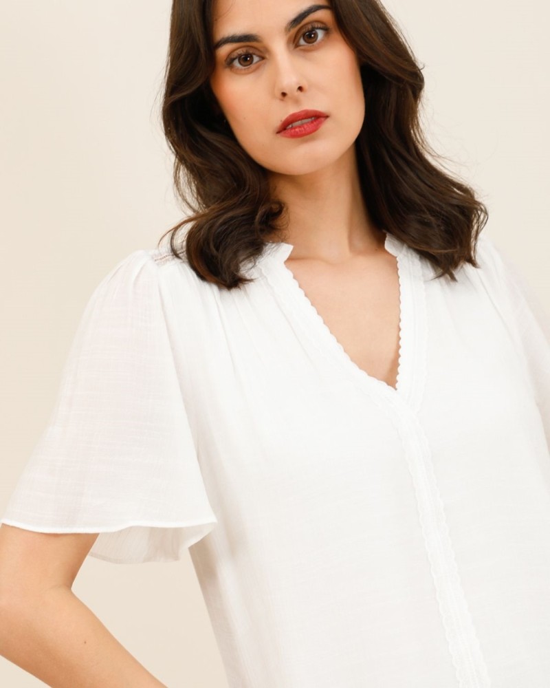 Son décolleté en V délicatement souligné de finitions festonnées apporte une touche romantique, tandis que ses manches courtes volantées ajoutent du mouvement et une allure bohème chic. Sa coupe fluide assure un confort absolu, idéale pour les journées ensoleillées comme pour les looks plus habillés.