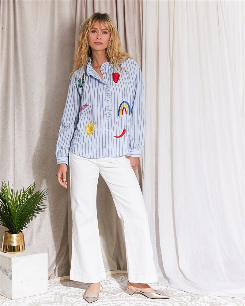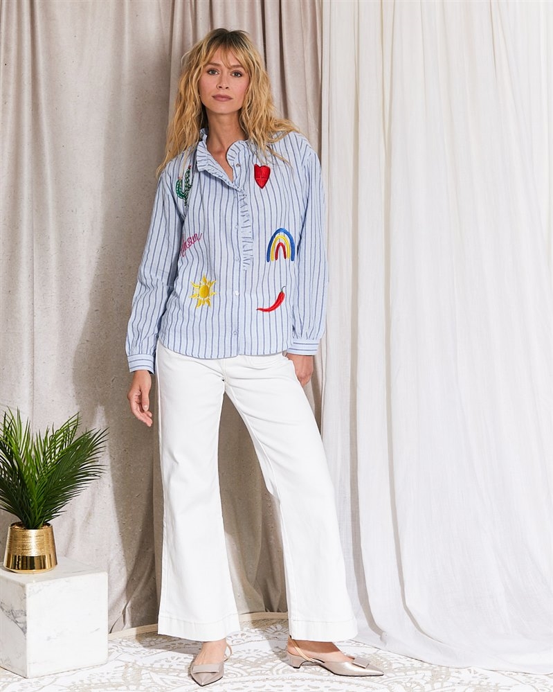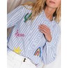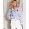 La blouse Rythme de la marque It Hippie est une pièce fun et pleine de caractère qui apporte une touche de fantaisie à votre dressing. Avec ses fines rayures verticales, ses broderies ludiques (cœur, arc-en-ciel, soleil, cactus, « amour ») et son col à petits volants, elle combine parfaitement style décontracté et détails raffinés. Facile à porter avec un jean blanc, un pantalon large ou une jupe fluide, elle donnera instantanément du pep’s à vos looks du quotidien. Idéale pour celles qui aiment mixer confort et originalité.
