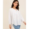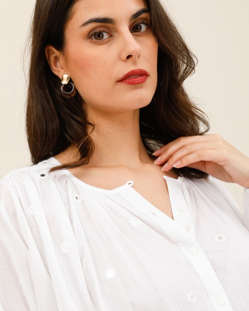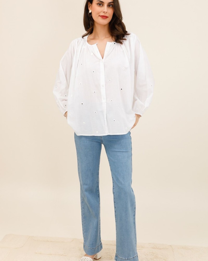 Ses détails ajourés subtils et ses finitions délicates apportent une touche d’élégance tout en restant discrète. Sa coupe ample et ses manches légèrement bouffantes assurent confort et modernité, tandis que son encolure épurée lui donne un style chic et intemporel.