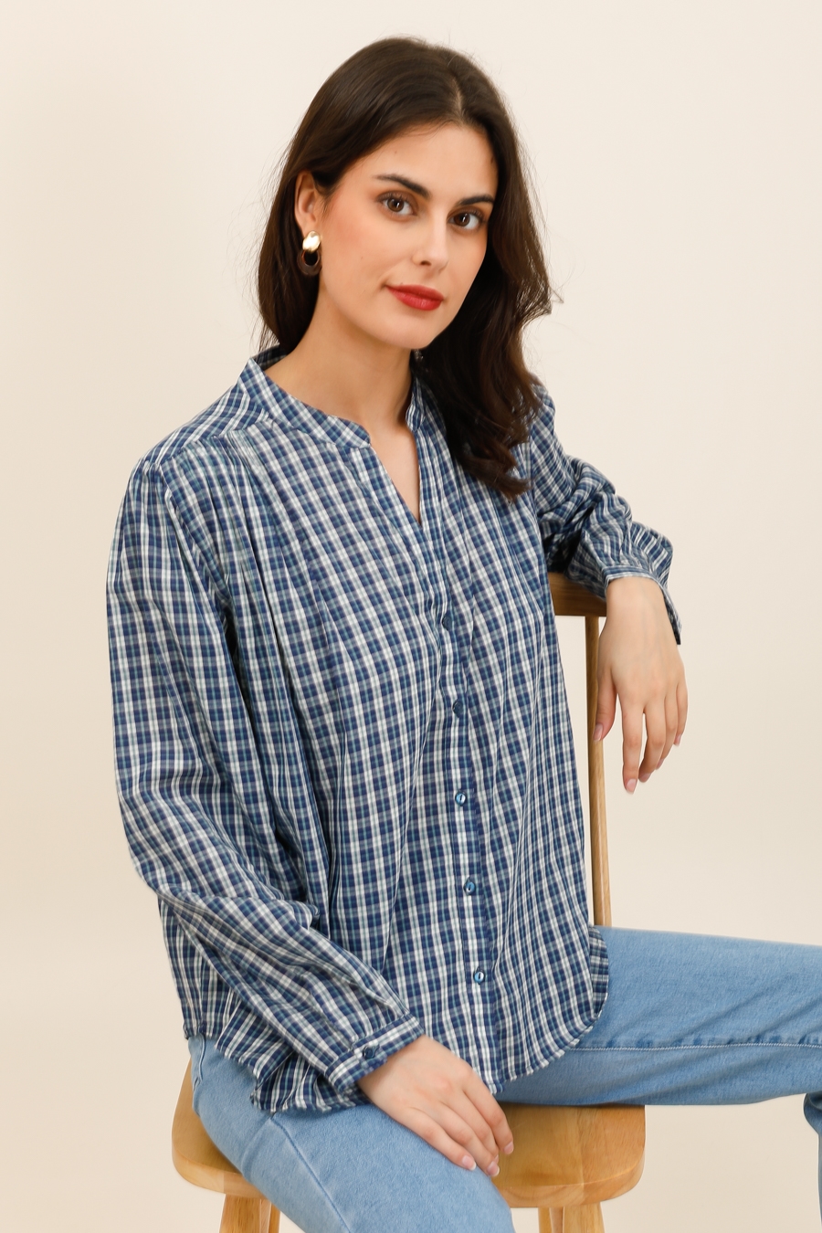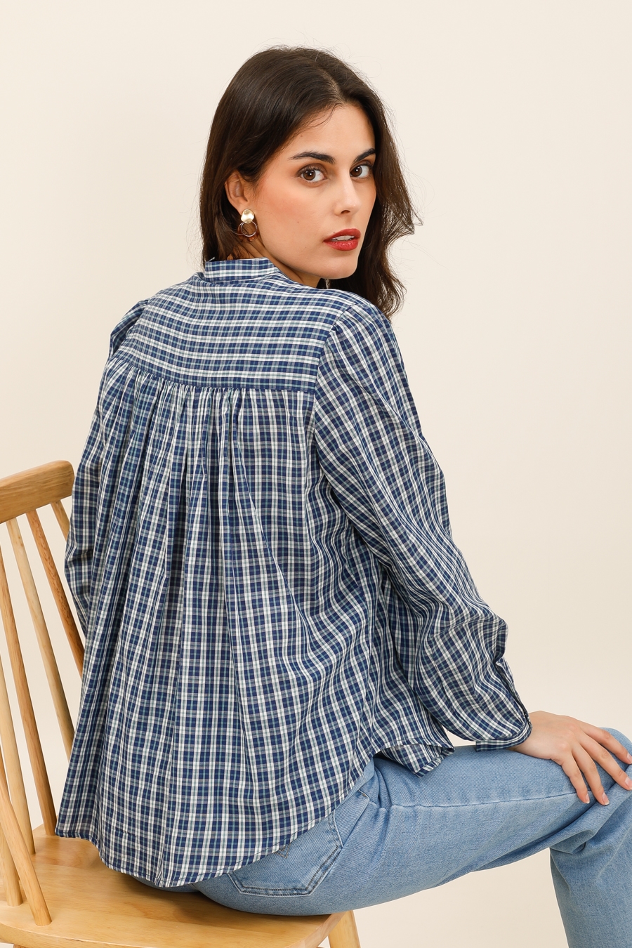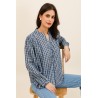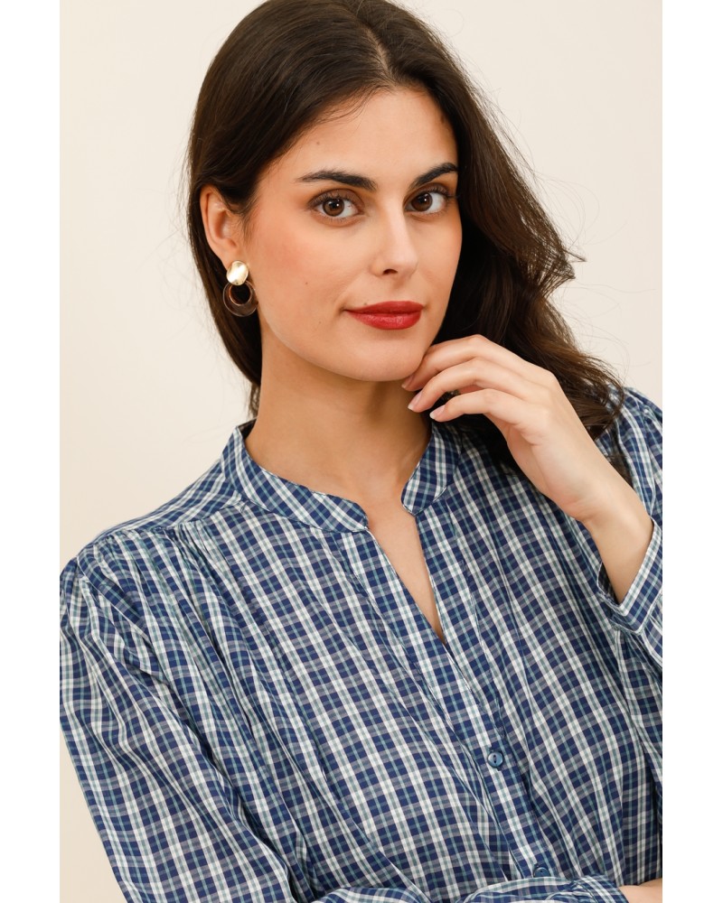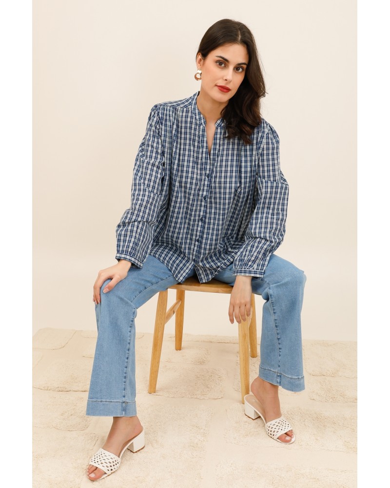 Sa coupe fluide et légèrement ample offre un confort optimal tout en laissant une belle liberté de mouvement. Son col tunisien et sa patte de boutonnage discrète apportent une touche moderne et féminine. Les fronces au dos ajoutent du volume et un joli tombé, pour une silhouette à la fois décontractée et raffinée.
