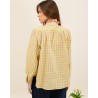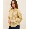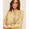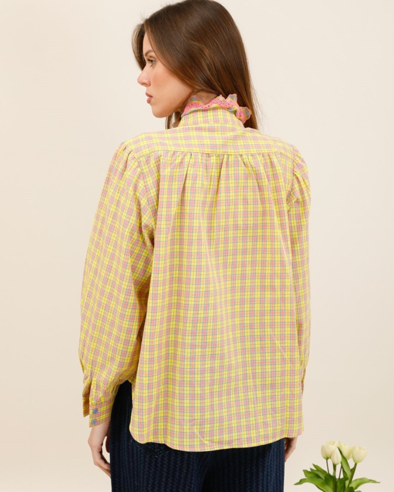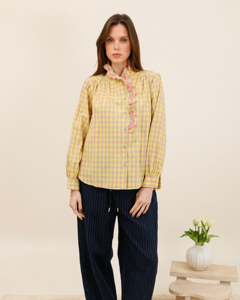 La chemise Alya est une pièce pleine de charme qui revisite le style rétro avec une touche contemporaine. Son imprimé à carreaux pastel illumine la silhouette, tandis que les volants délicats au col apportent une note romantique et raffinée.