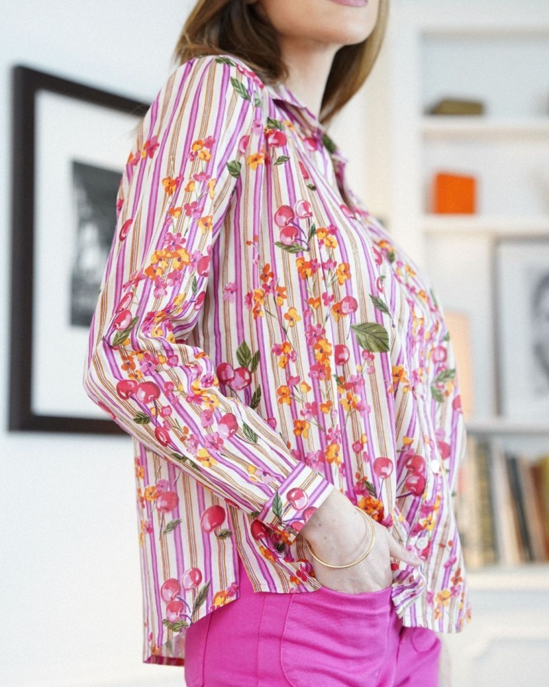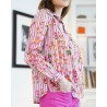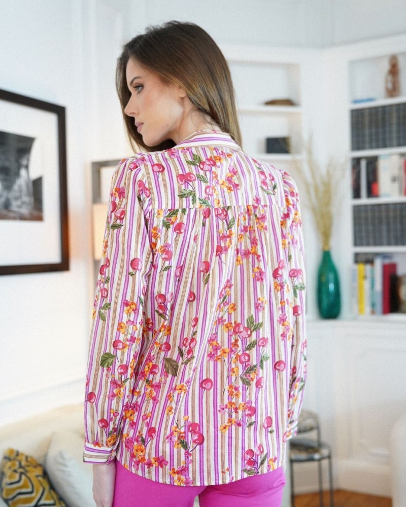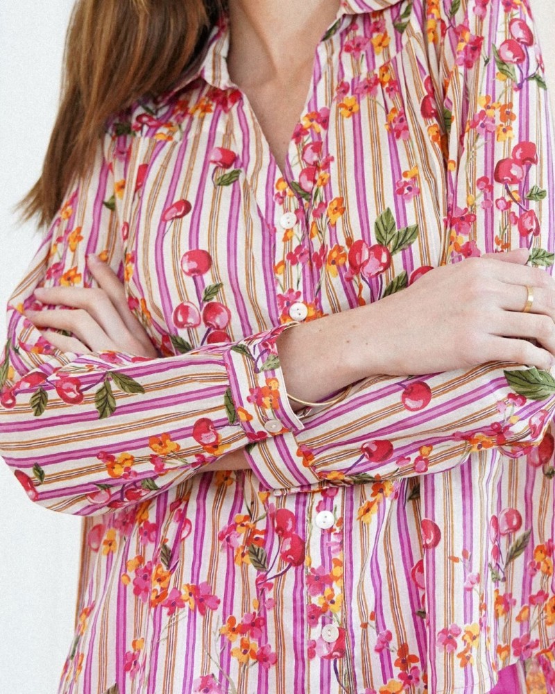 La chemise Charmy est une pièce lumineuse et pleine de fraîcheur qui apporte une touche de fantaisie à votre garde-robe. Son imprimé délicat mêlant rayures colorées et motifs floraux évoque l’esprit printanier et féminin, parfait pour illuminer une tenue.