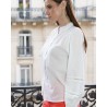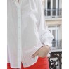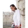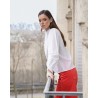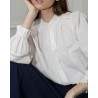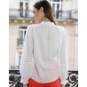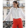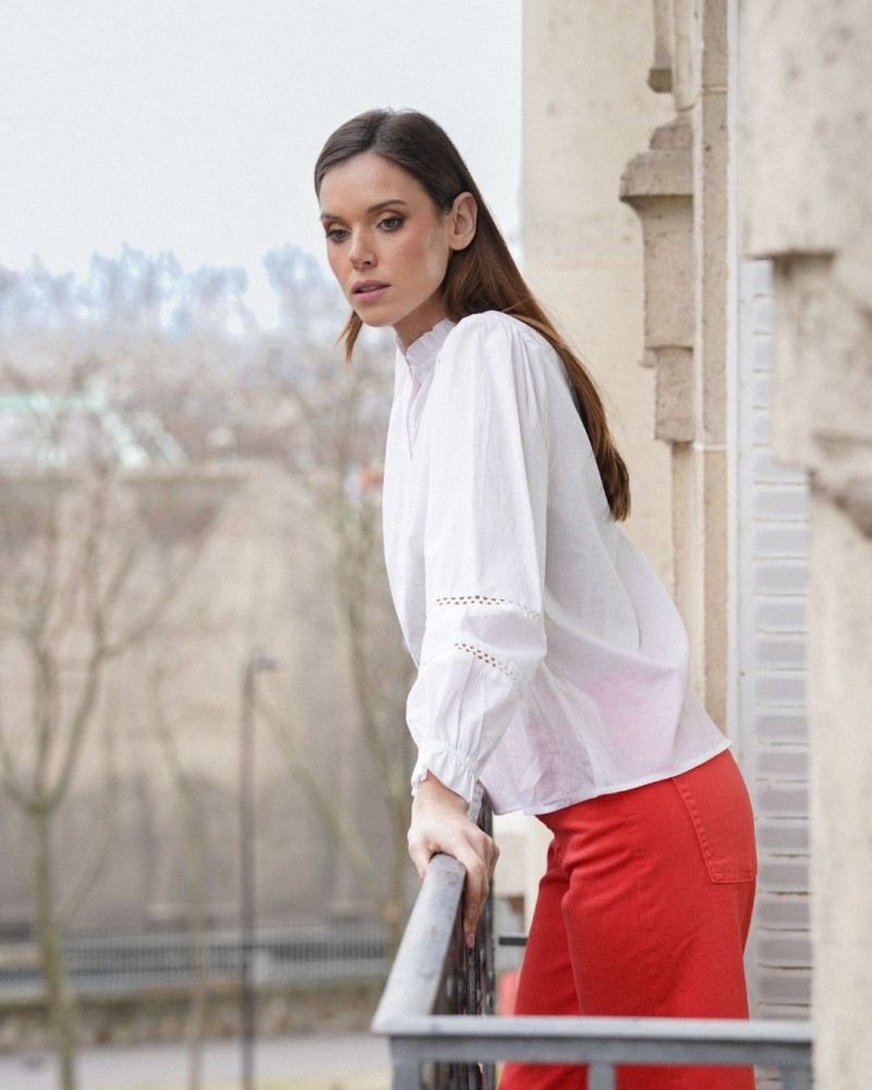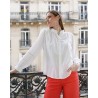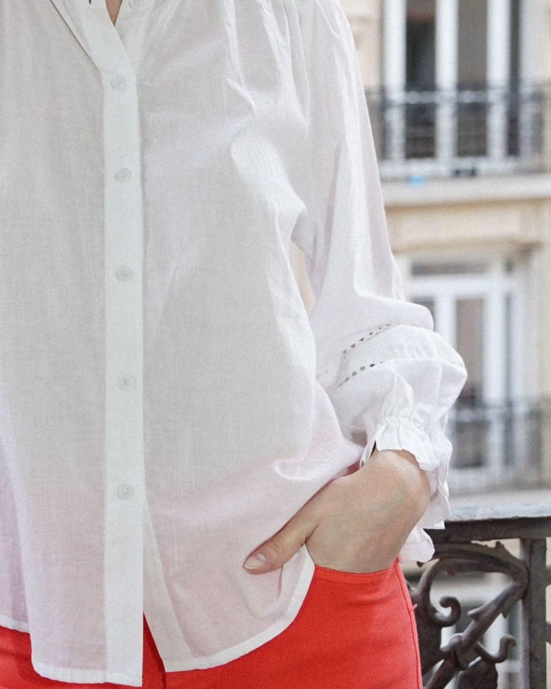 Ses manches longues légèrement bouffantes se terminent par des poignets élastiqués volantés, créant une silhouette douce et sophistiquée. Facile à porter au quotidien, la chemise Dorothé se marie aussi bien avec un jean pour un look casual chic qu’avec un pantalon habillé pour une allure plus élégante.
