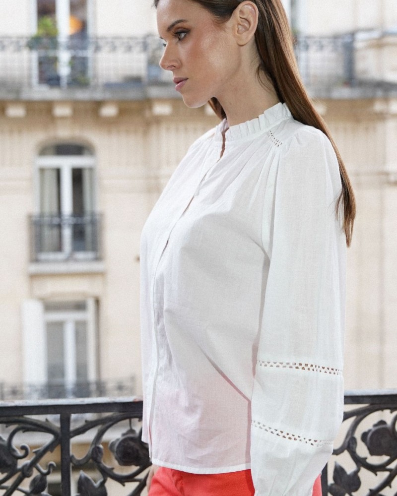 La chemise Dorothé incarne l’élégance féminine avec ses détails délicats et sa coupe fluide. Confectionnée dans un tissu léger et agréable à porter, elle se distingue par son col légèrement volanté qui apporte une touche romantique et raffinée. Les empiècements ajourés au niveau des épaules et des manches ajoutent un subtil jeu de transparence qui souligne le caractère élégant de la pièce.