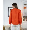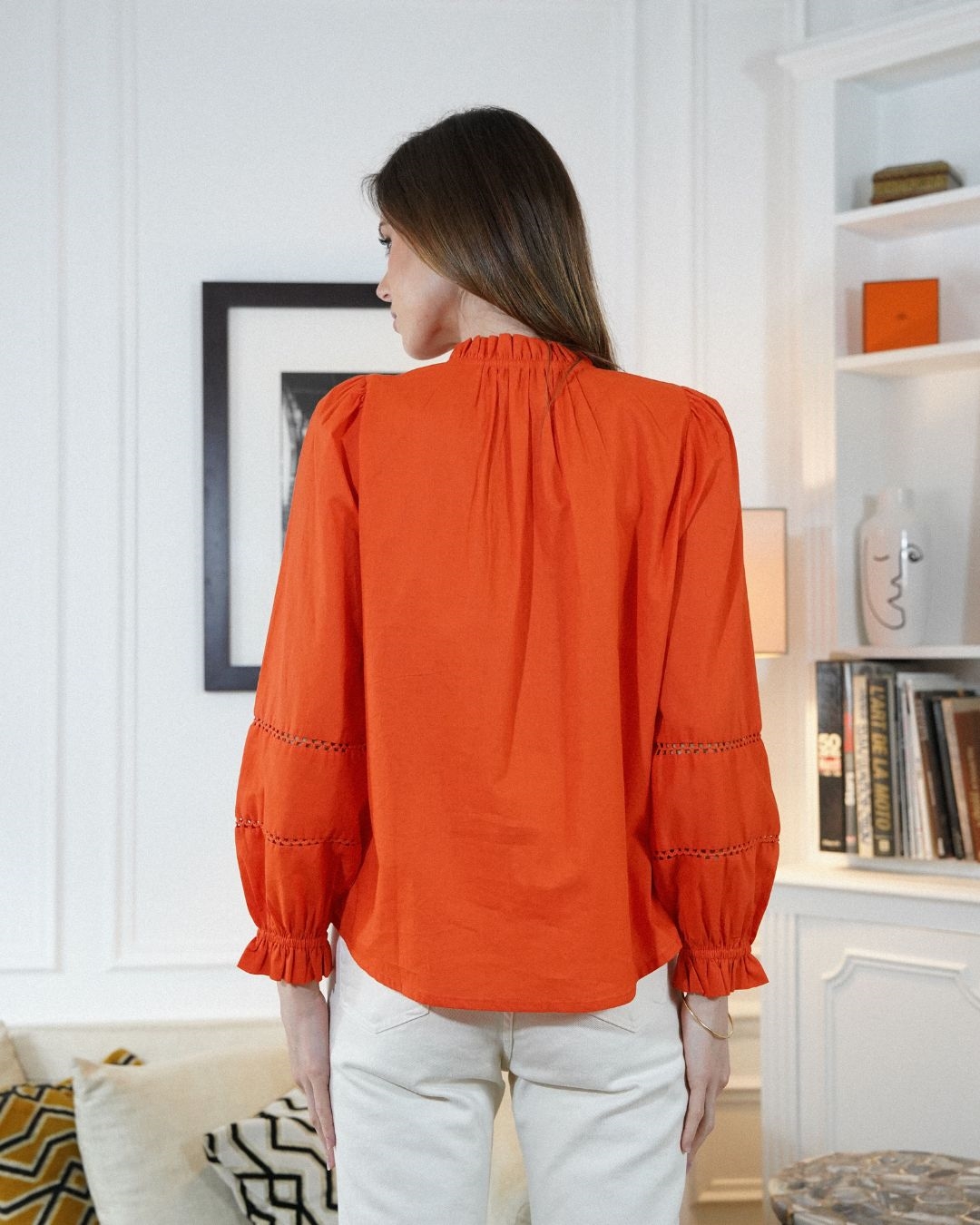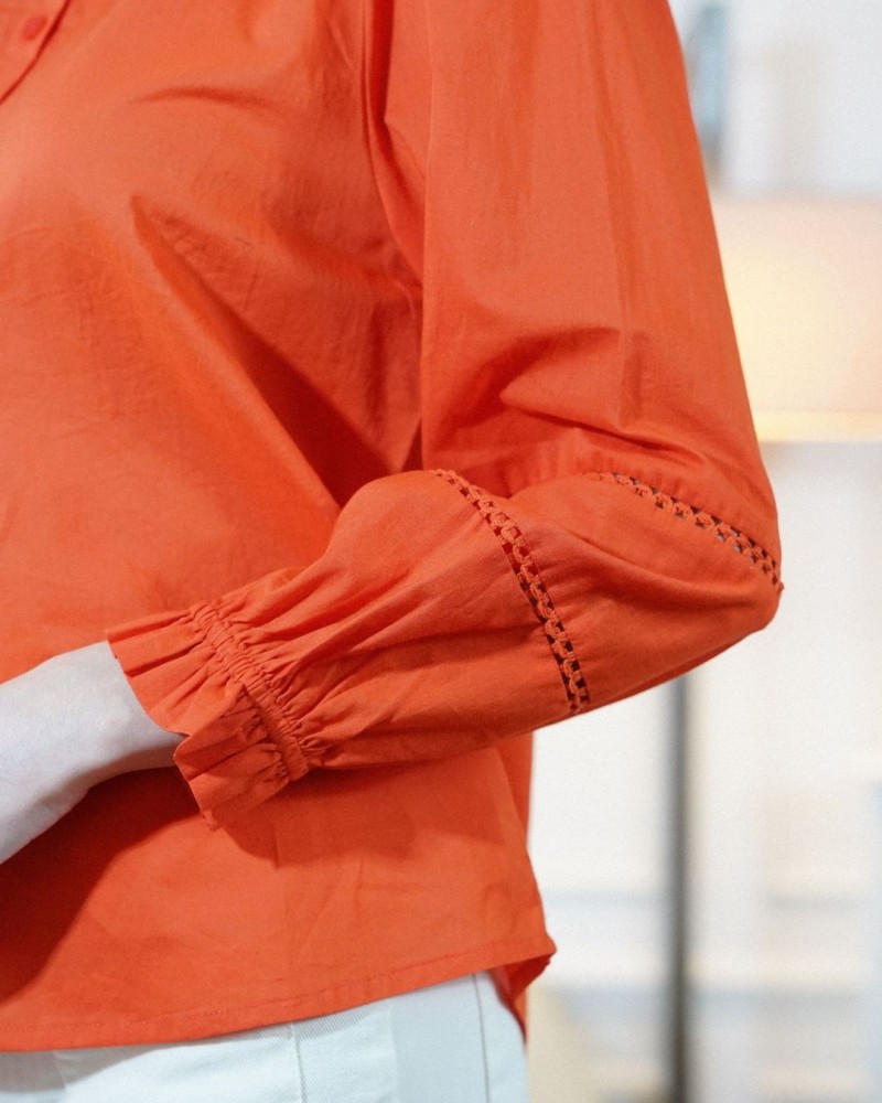 Ses manches longues légèrement bouffantes se terminent par des poignets élastiqués volantés, créant une silhouette douce et sophistiquée. Facile à porter au quotidien, la chemise Dorothé se marie aussi bien avec un jean pour un look casual chic qu’avec un pantalon habillé pour une allure plus élégante.