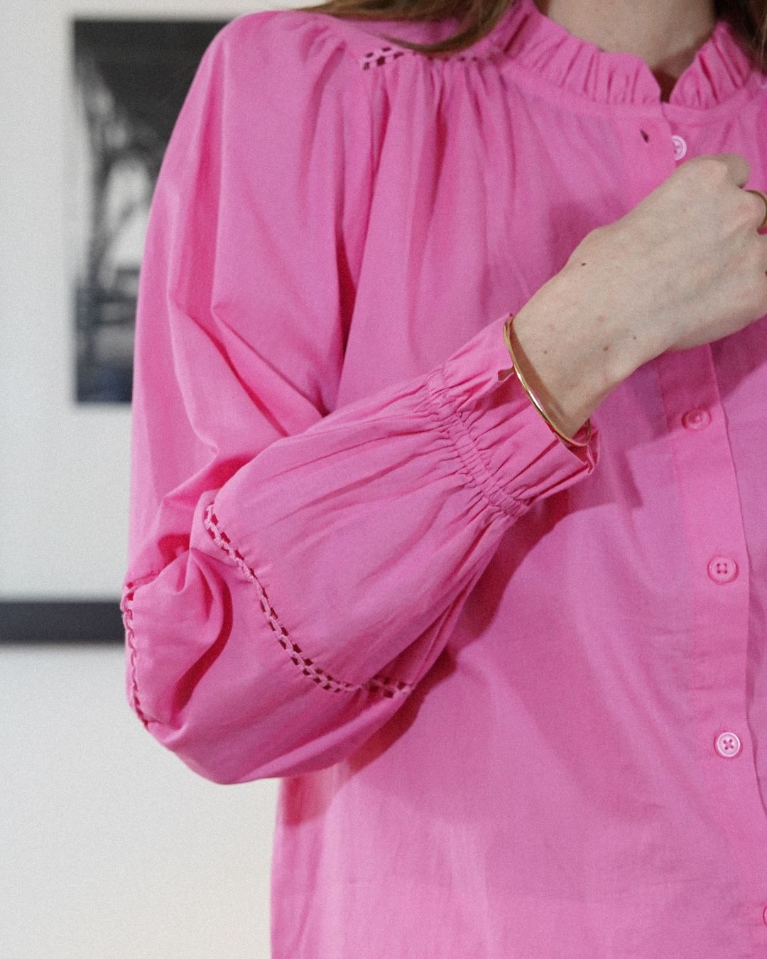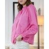 Ses manches longues légèrement bouffantes se terminent par des poignets élastiqués volantés, créant une silhouette douce et sophistiquée. Facile à porter au quotidien, la chemise Dorothé se marie aussi bien avec un jean pour un look casual chic qu’avec un pantalon habillé pour une allure plus élégante.