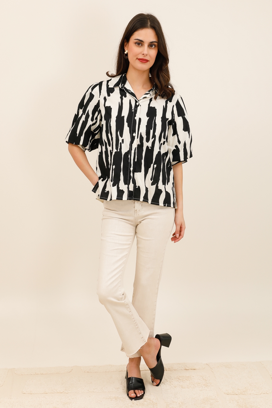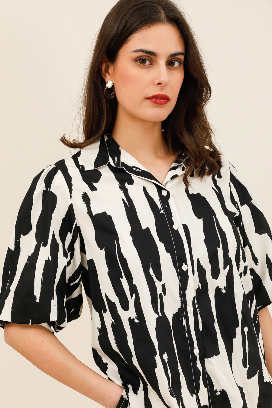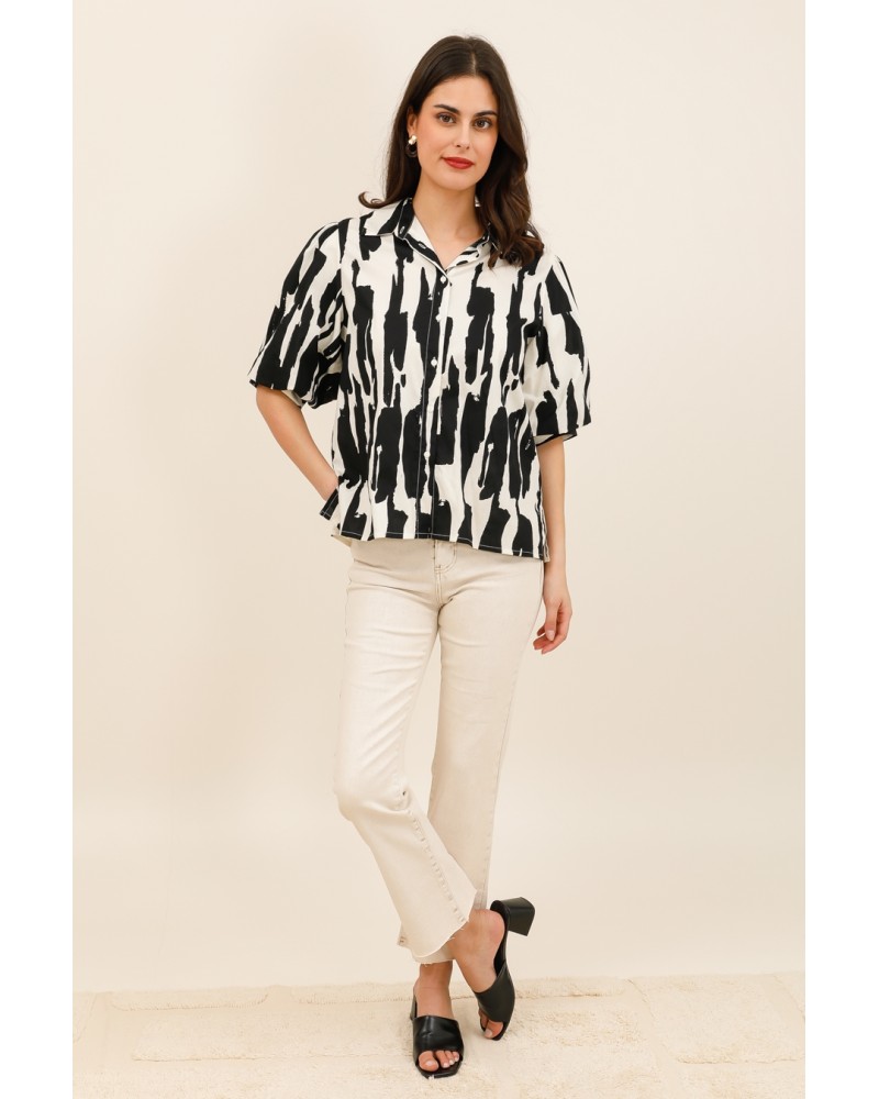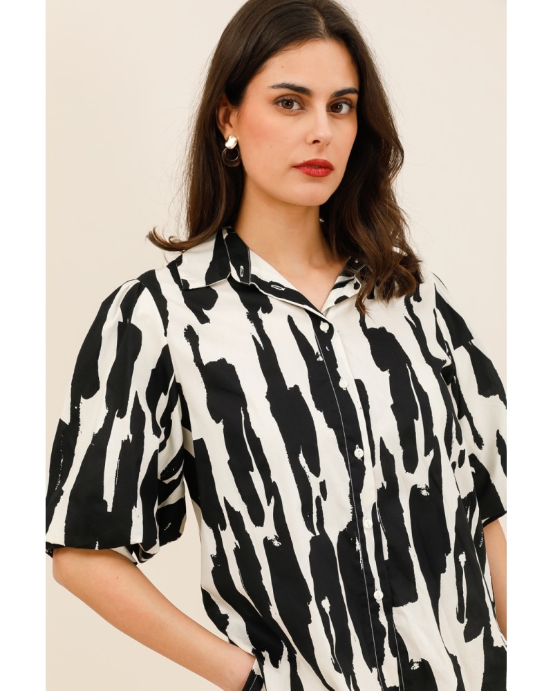 Conçu dans une matière légère et fluide, il offre un tombé naturel et un confort optimal au quotidien. Son col chemise classique et sa fermeture boutonnée structurent la silhouette, tandis que ses manches courtes amples ajoutent du volume et une allure décontractée chic.