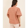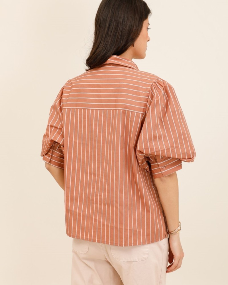 Son col chemise intemporel et sa fermeture boutonnée apportent une allure élégante, tandis que ses manches courtes légèrement bouffantes ajoutent une note de féminité et de volume. Sa coupe droite et fluide assure un confort optimal tout au long de la journée.