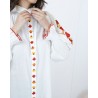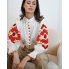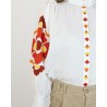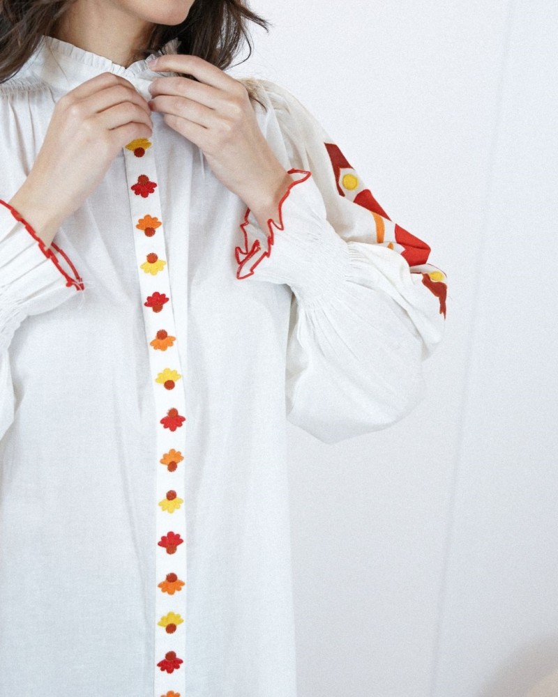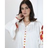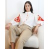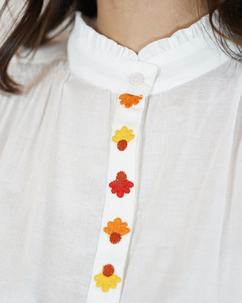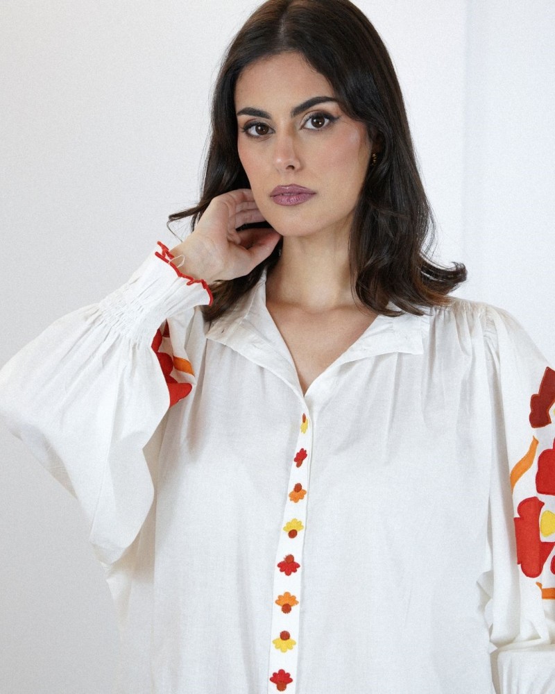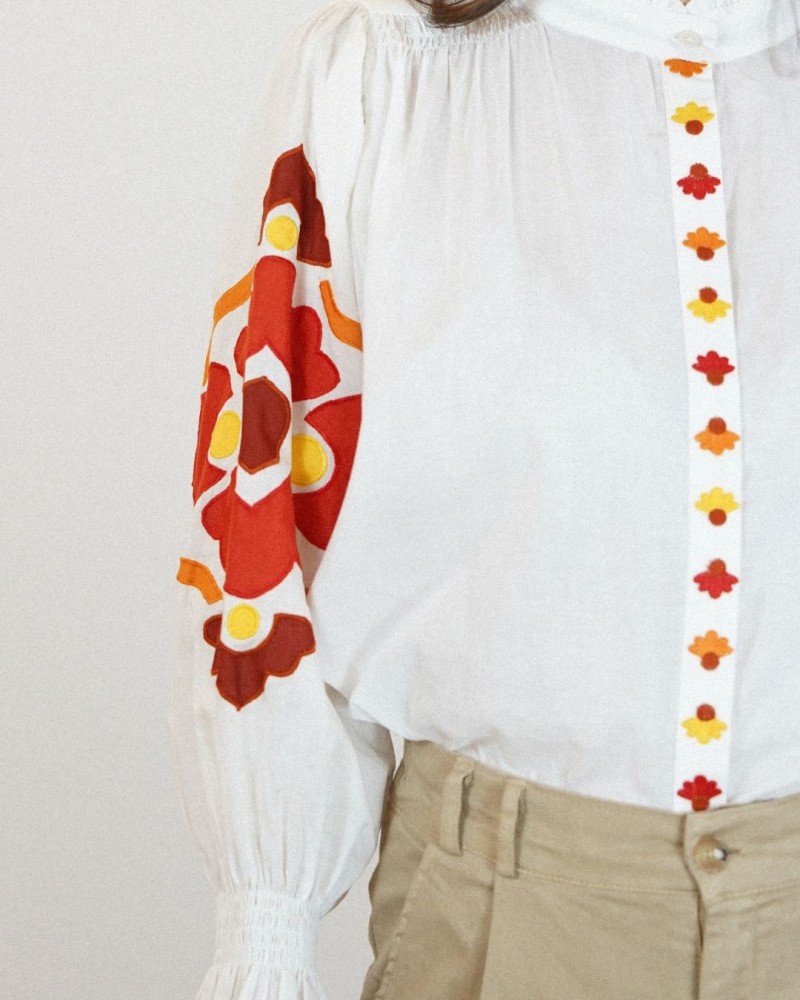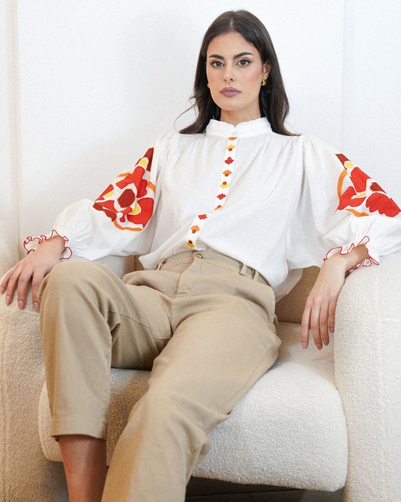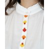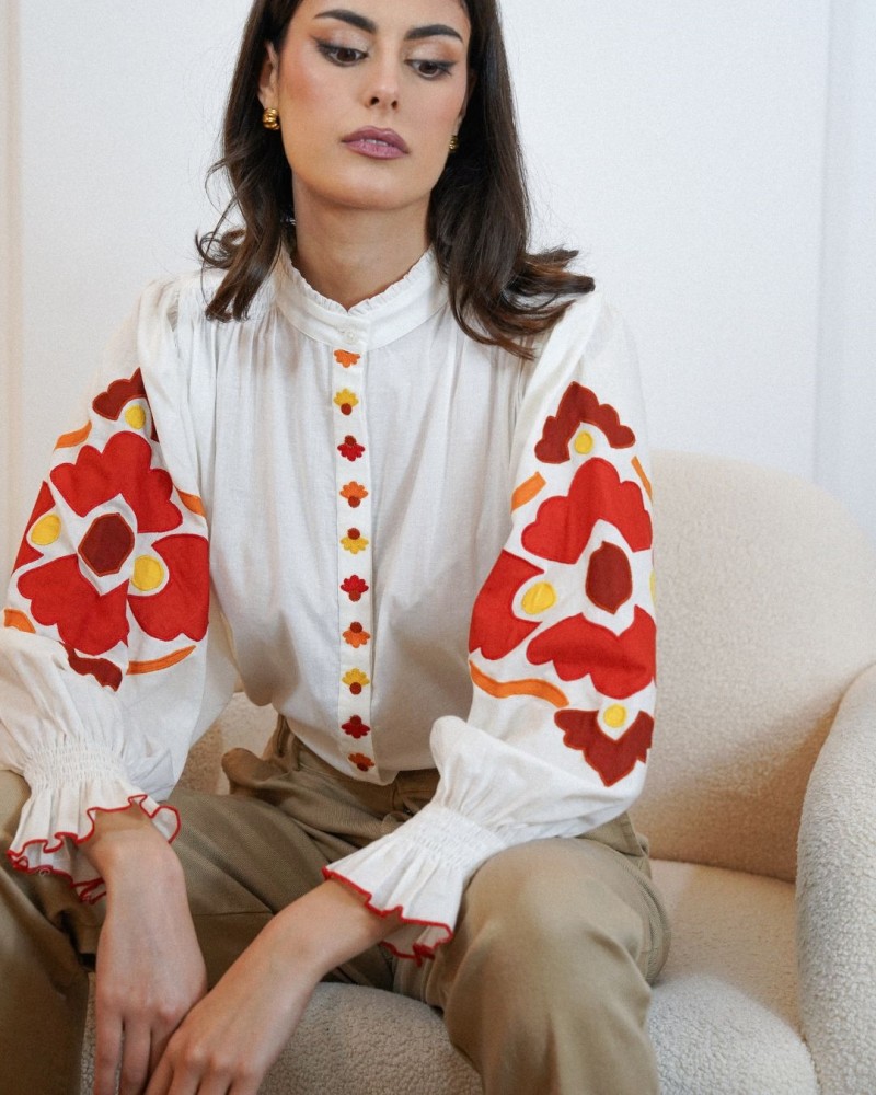 Son col légèrement volanté apporte une touche raffinée et féminine, tandis que les boutons décoratifs brodés sur le devant ajoutent un détail subtil et unique. Les manches longues légèrement bouffantes, ornées de motifs floraux colorés, donnent à cette chemise une allure moderne et élégante.