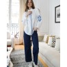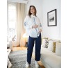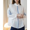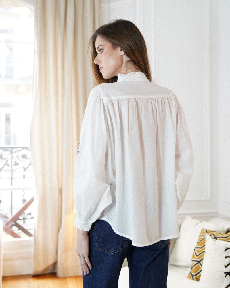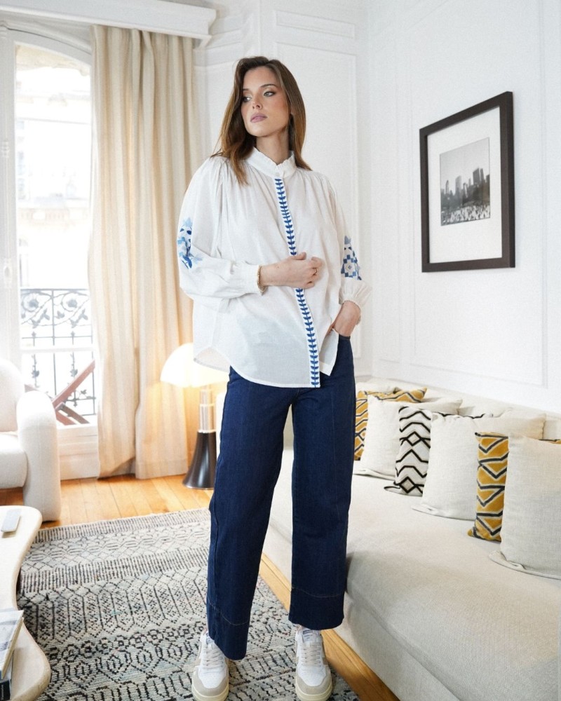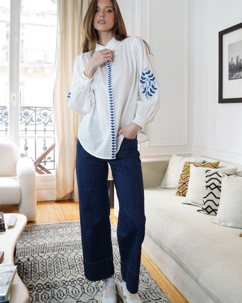 Disponible en plusieurs versions — blanche brodée ou rayée avec broderies bleues — la chemise Leiva est idéale pour composer des looks à la fois élégants, modernes et intemporels.