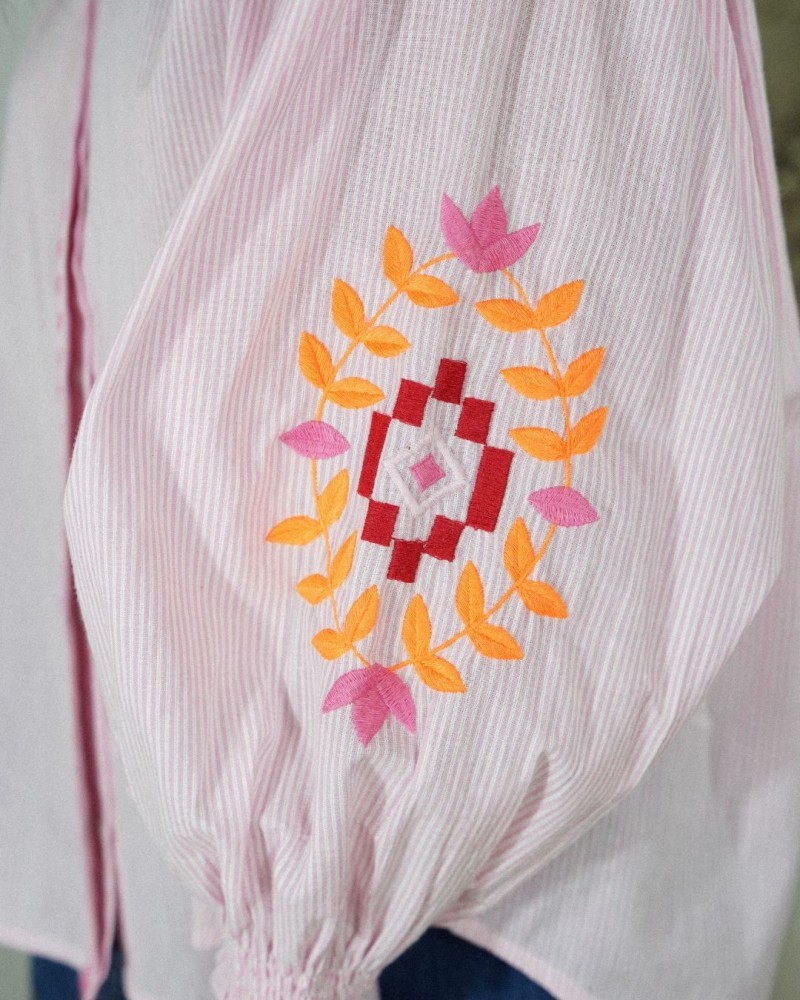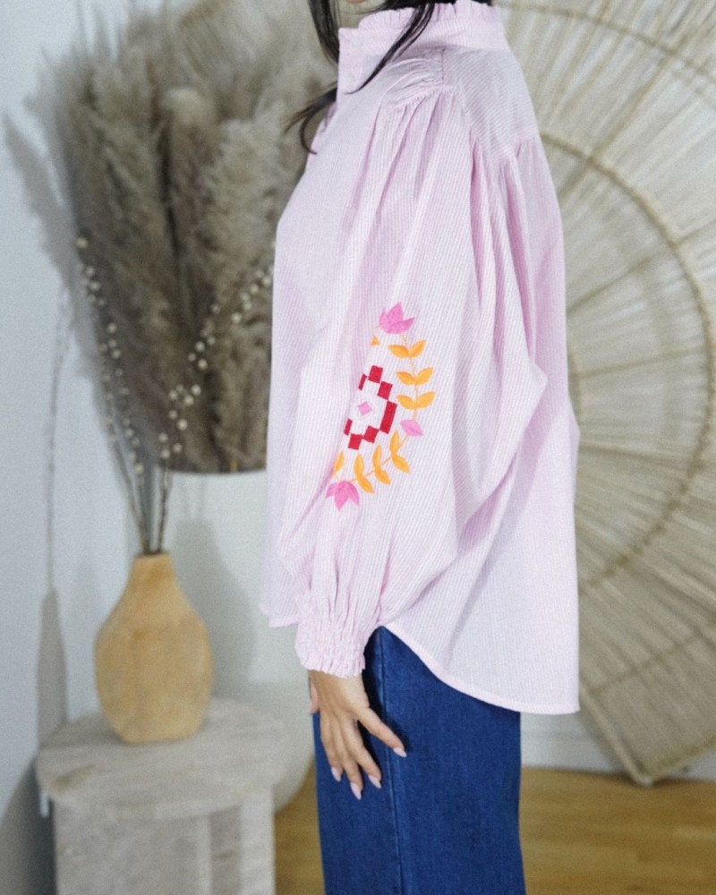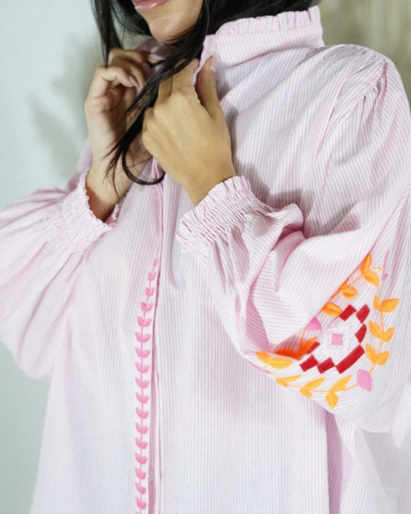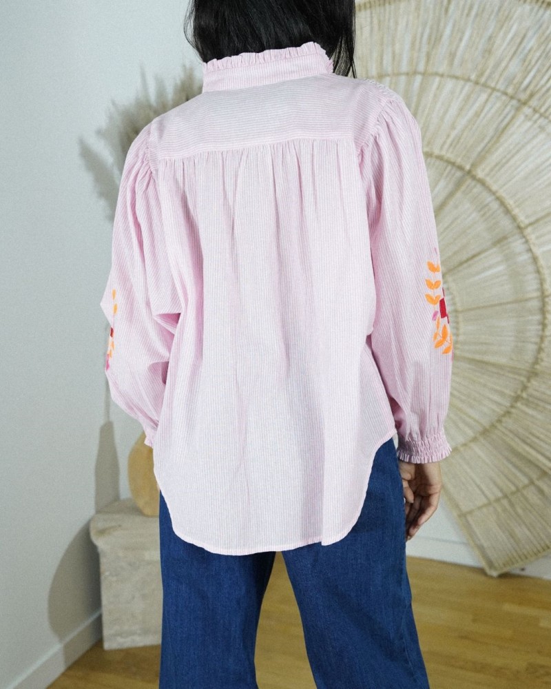La chemise Leiva incarne l’élégance naturelle avec une touche artisanale. Son design raffiné se distingue par de délicates broderies végétales placées au centre et sur les manches, qui apportent relief et caractère à cette pièce féminine.
