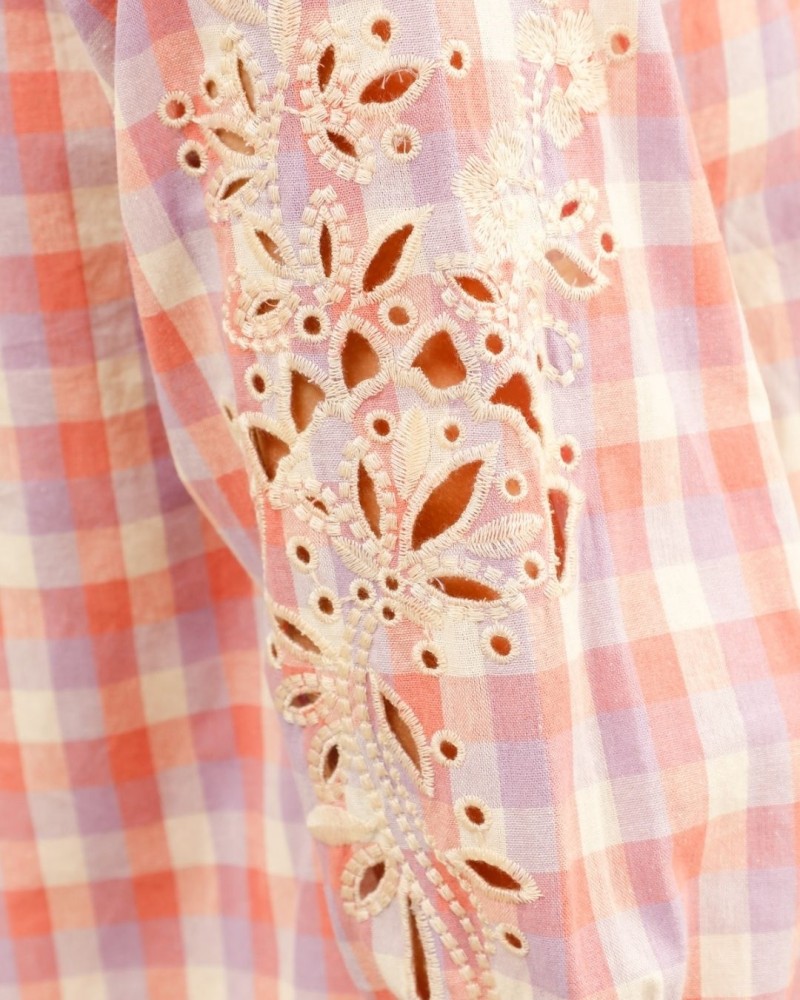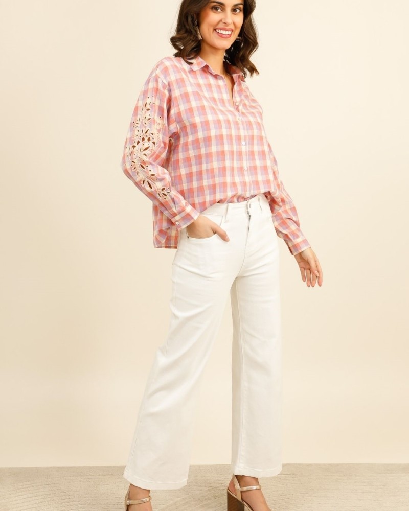 Douce et lumineuse, la chemise Lia séduit par son motif à carreaux pastel et ses détails délicats qui apportent une touche de romantisme moderne. Confectionnée dans un tissu léger et agréable à porter, elle est sublimée par de superbes broderies ajourées sur les manches, créant un jeu de transparence élégant et raffiné.