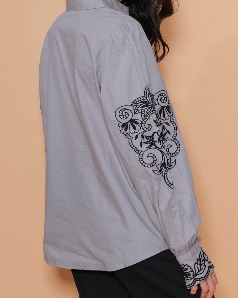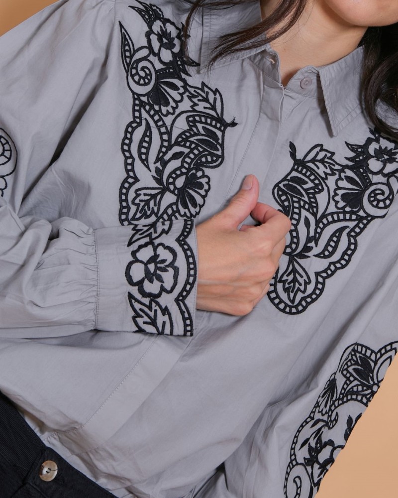 • Broderie florale tout le long de la fermeture, au niveau des coudes et des poignets