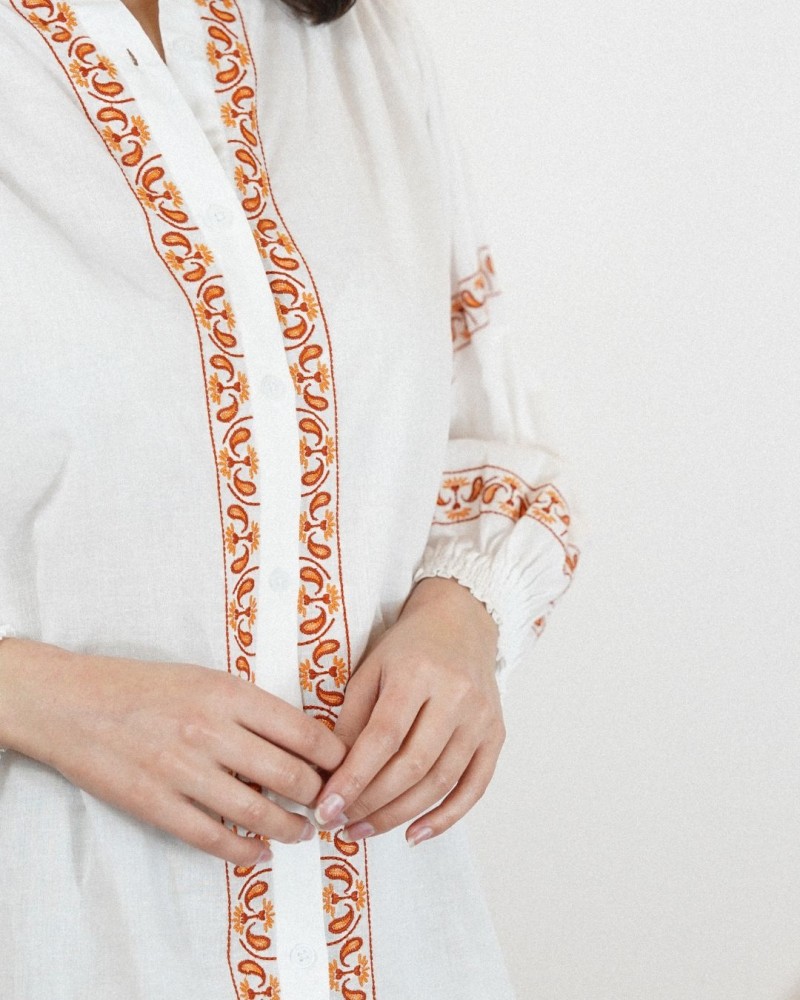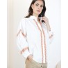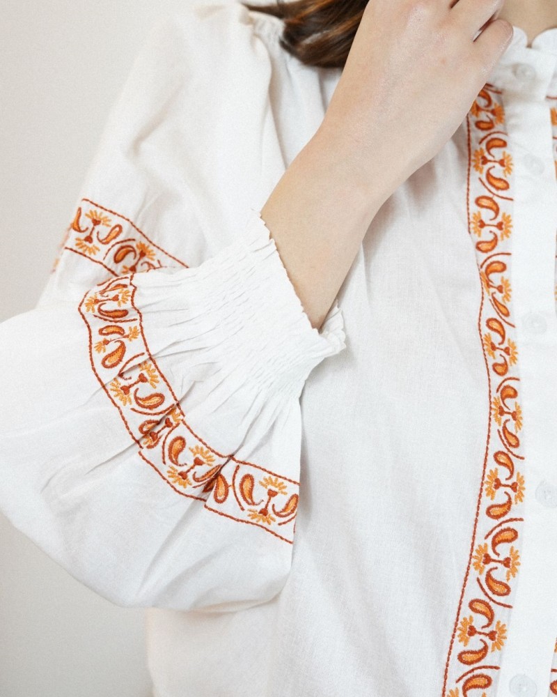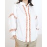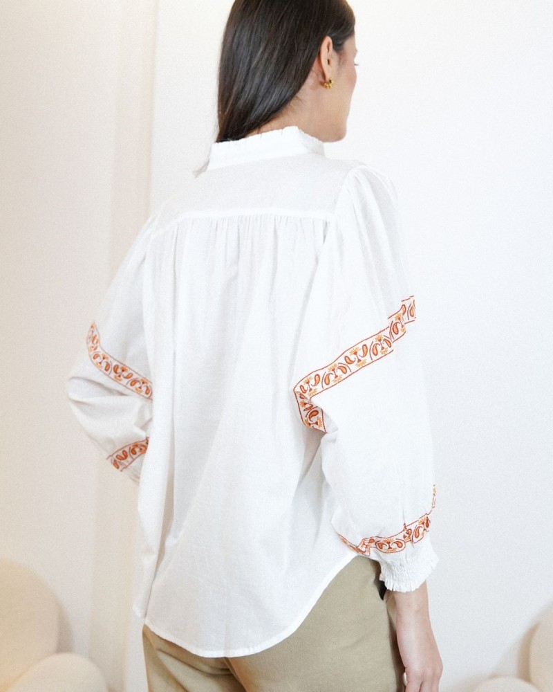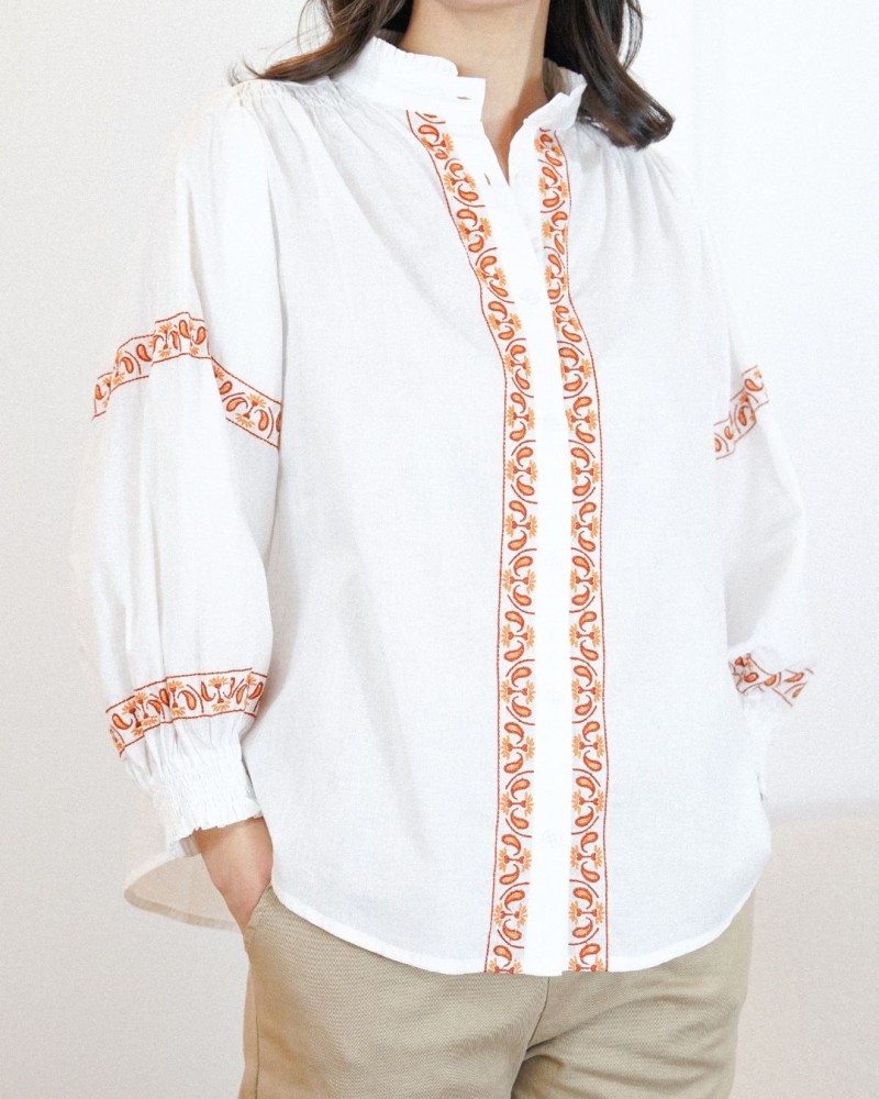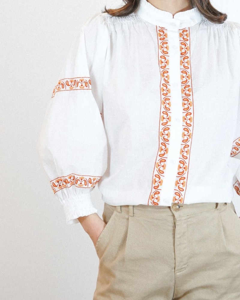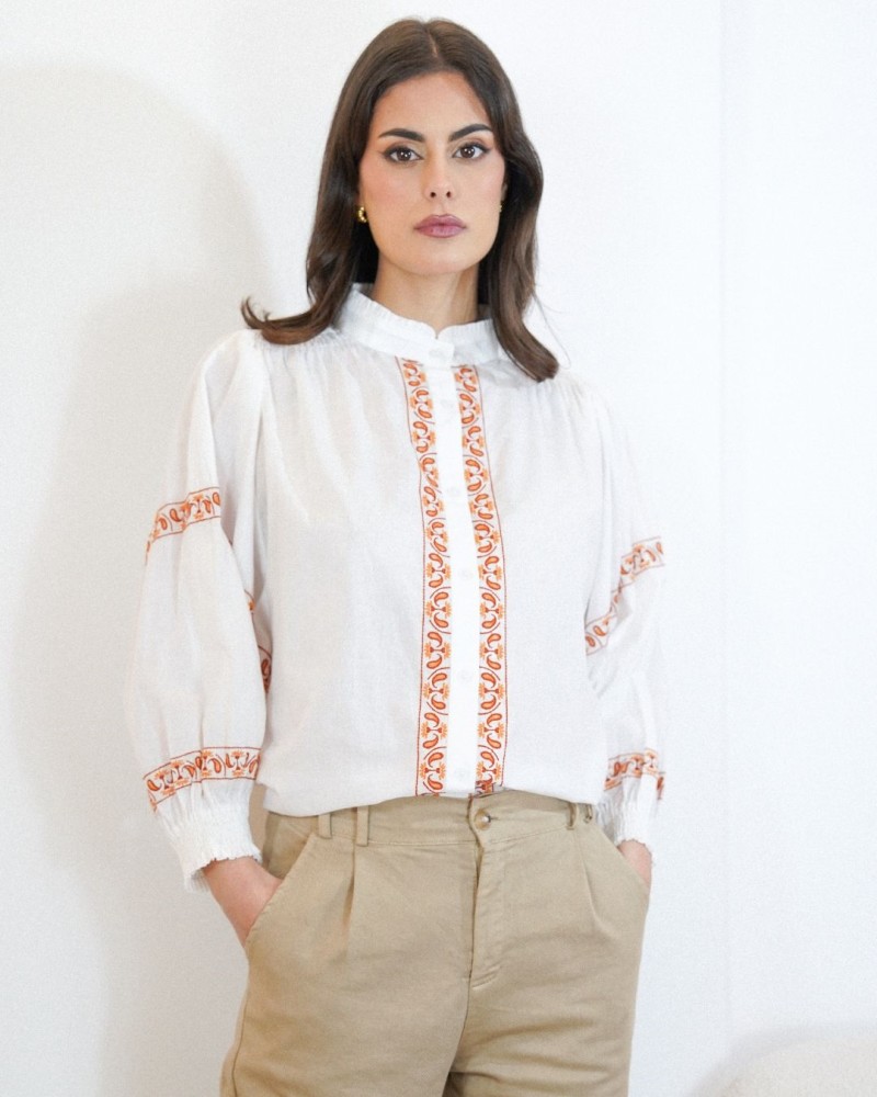 Disponible en plusieurs coloris de broderies, la chemise Matha est idéale pour créer un look élégant et lumineux, aussi bien avec un pantalon habillé qu’avec un jean pour un style plus décontracté.