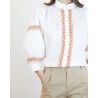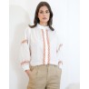 Son col légèrement froncé apporte une note féminine et sophistiquée, tandis que les broderies décoratives le long de la patte de boutonnage et sur les manches ajoutent un détail subtil et élégant. Les manches longues légèrement bouffantes, terminées par des poignets froncés, renforcent son style chic et moderne.