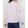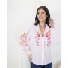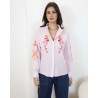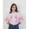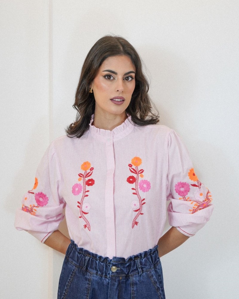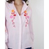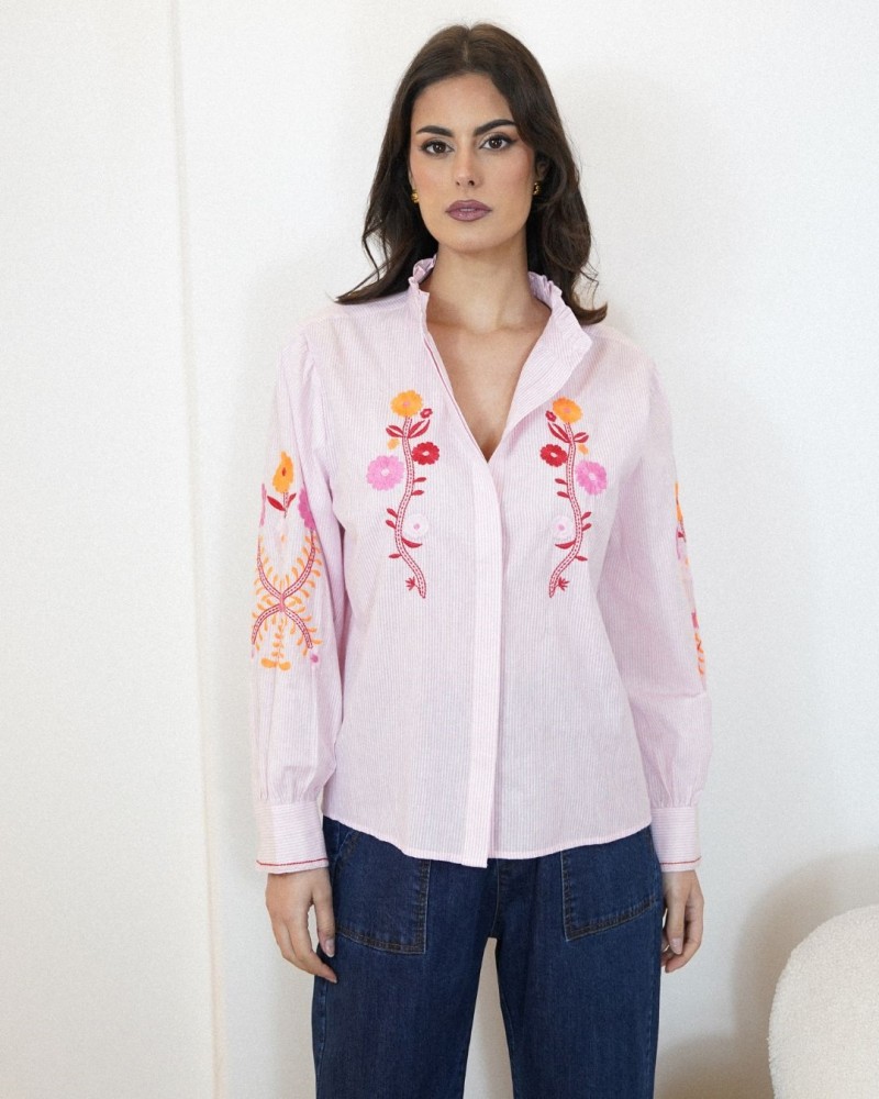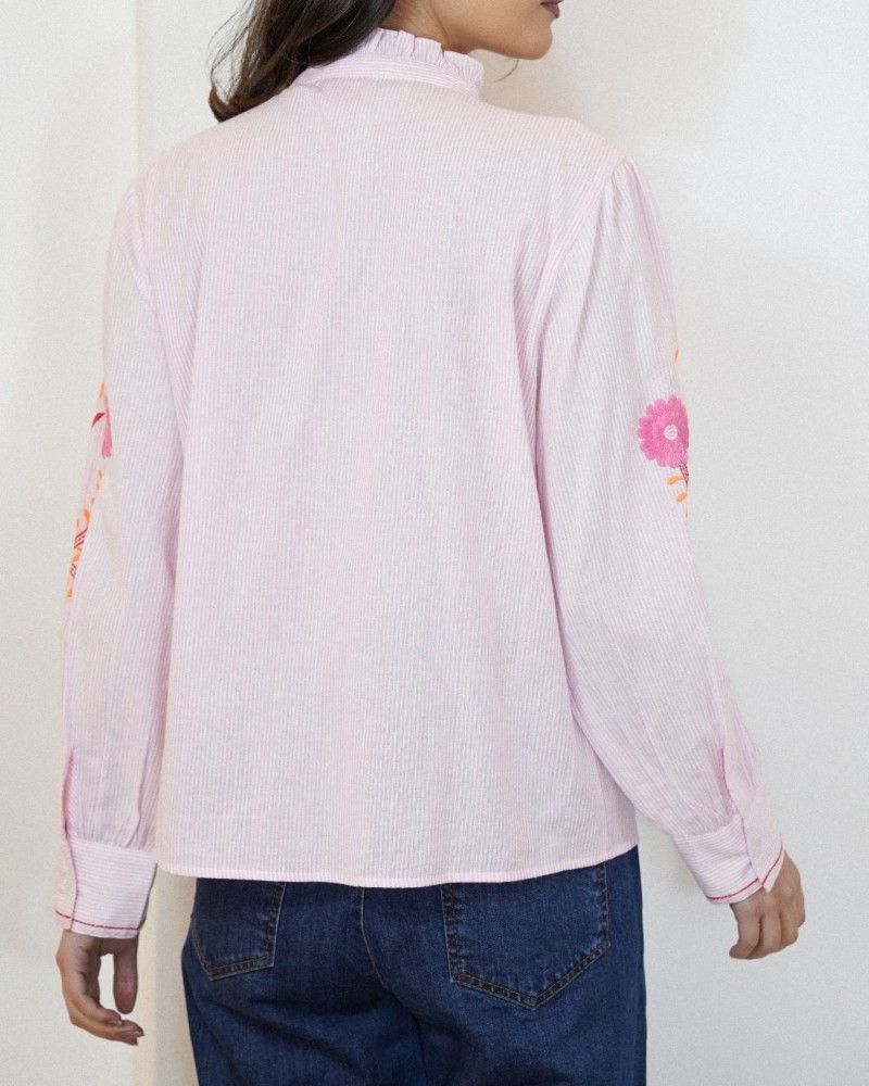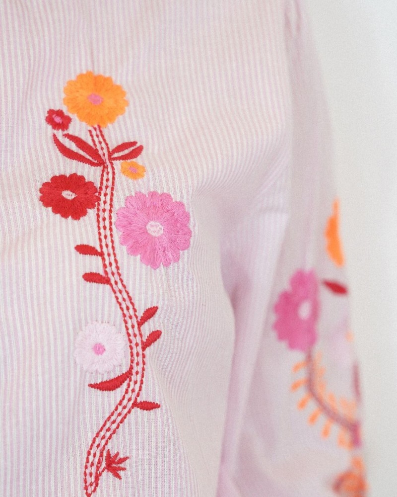 La chemise Myrtille allie élégance et délicatesse grâce à ses fines rayures et ses broderies florales raffinées. Son design féminin est sublimé par un col légèrement volanté qui apporte une touche romantique et moderne.