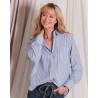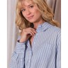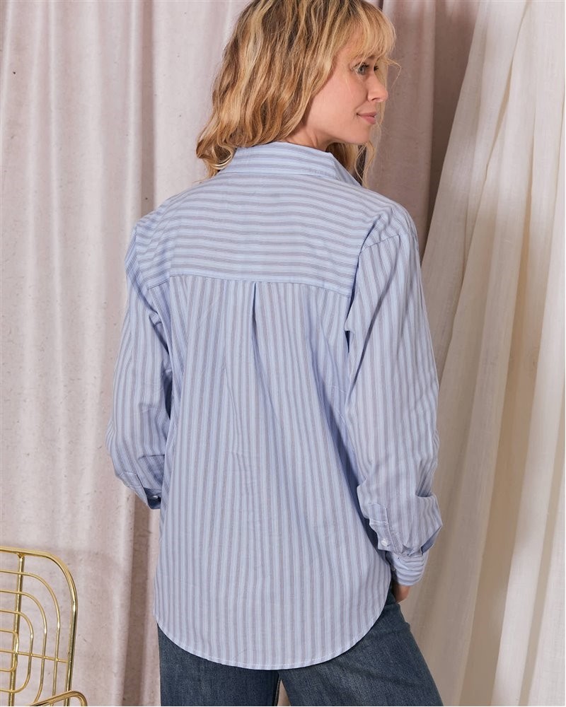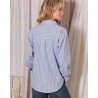 La chemise Olivia, avec ses fines rayures bleues et son col à revers, incarne un style professionnel et raffiné. Confectionnée dans une matière légère, elle est parfaite pour les journées estivales au bureau ou les rendez-vous habillés. Ses manches longues se terminent par des poignets à double boutons, apportant une finition soignée et structurée. Sa fermeture boutonnée complète un look intemporel, à porter rentrée dans un pantalon taille haute ou légèrement ouverte pour un style plus décontracté.