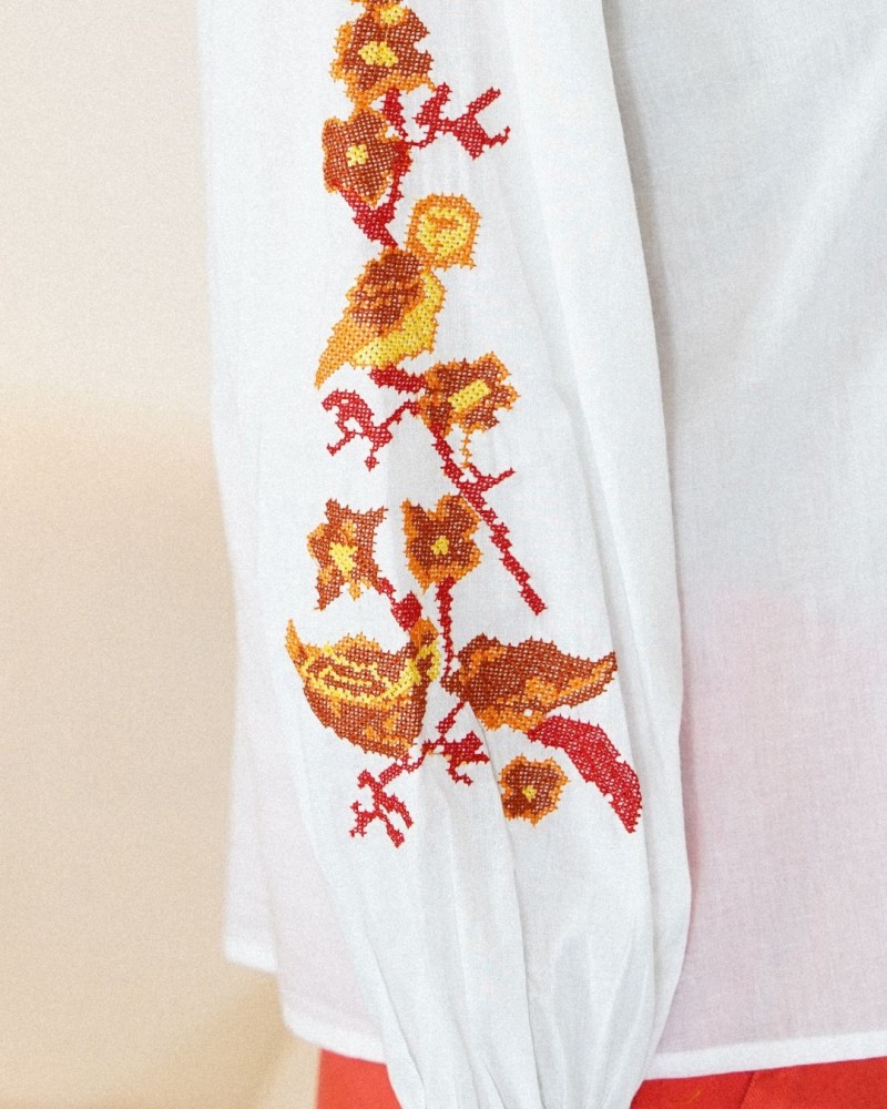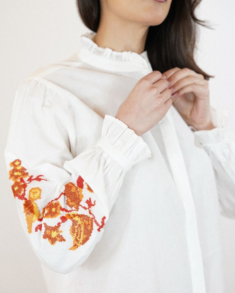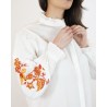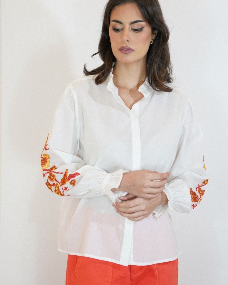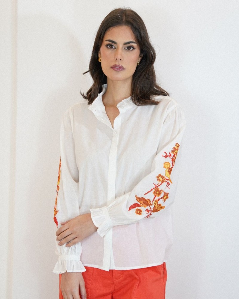 Son col légèrement volanté ajoute une note raffinée tandis que les broderies florales placées le long des manches apportent du caractère et une touche artisanale à la pièce. Les manches longues légèrement bouffantes, terminées par des poignets volantés, renforcent son allure romantique et élégante.