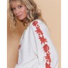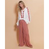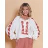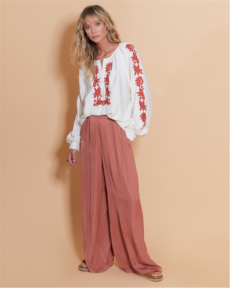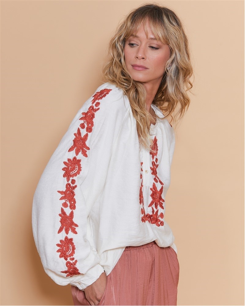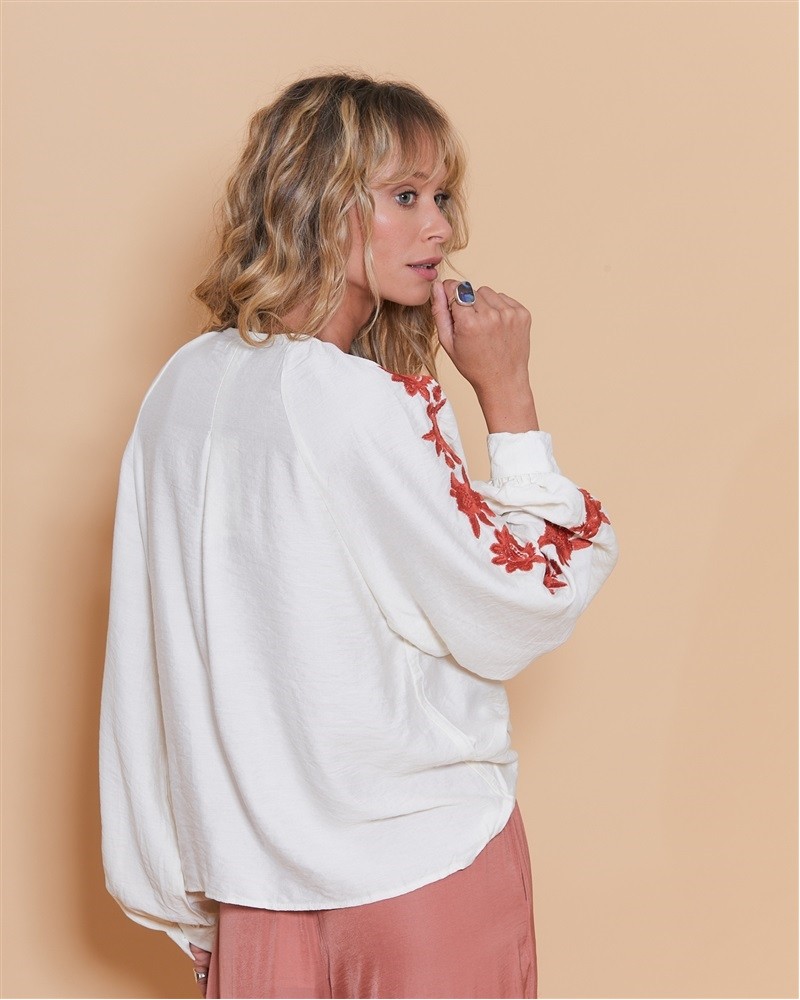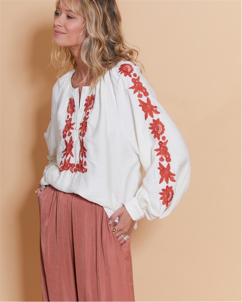 • Broderie florale couleur rouille tout le long de la fermeture et des manches
