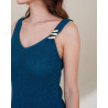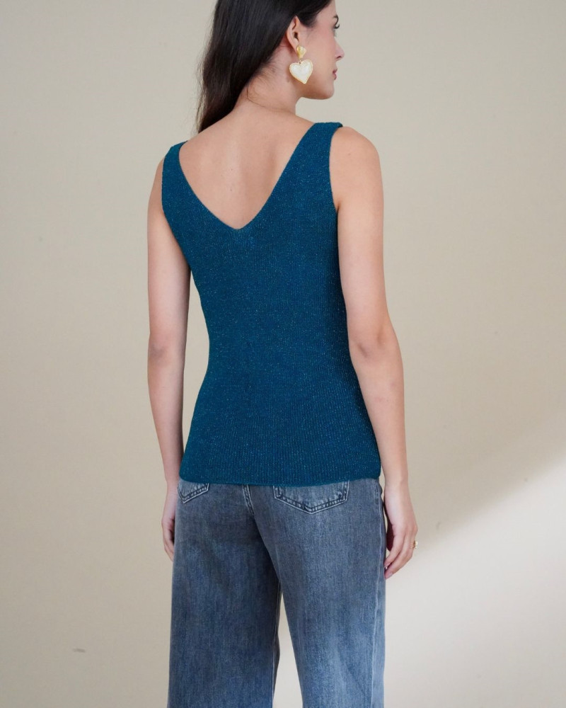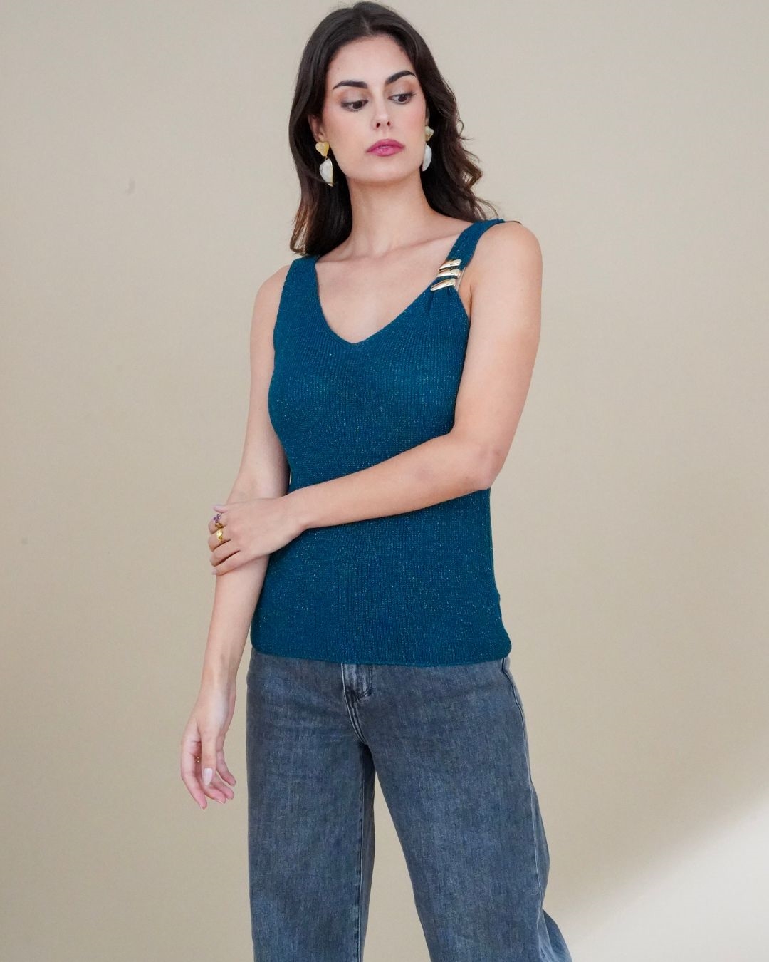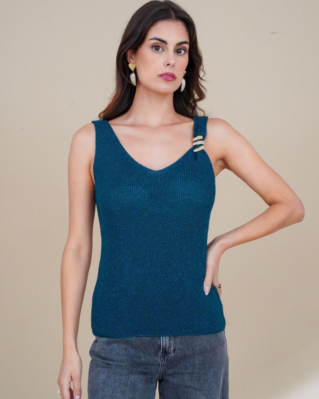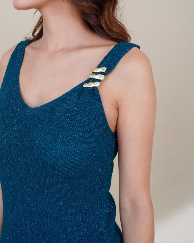 Le débardeur Diego est une pièce chic et contemporaine qui attire immédiatement le regard. Conçu dans une maille scintillante, il se distingue par ses détails élégants : une encolure en V flatteuse et une bretelle ornée de trois anneaux métalliques dorés, qui apportent une touche sophistiquée et originale. Sa coupe ajustée épouse la silhouette avec confort, tandis que son dos en V ajoute une subtile note de féminité. Parfait à porter seul pour une allure affirmée, ou sous une veste pour un look raffiné et moderne.