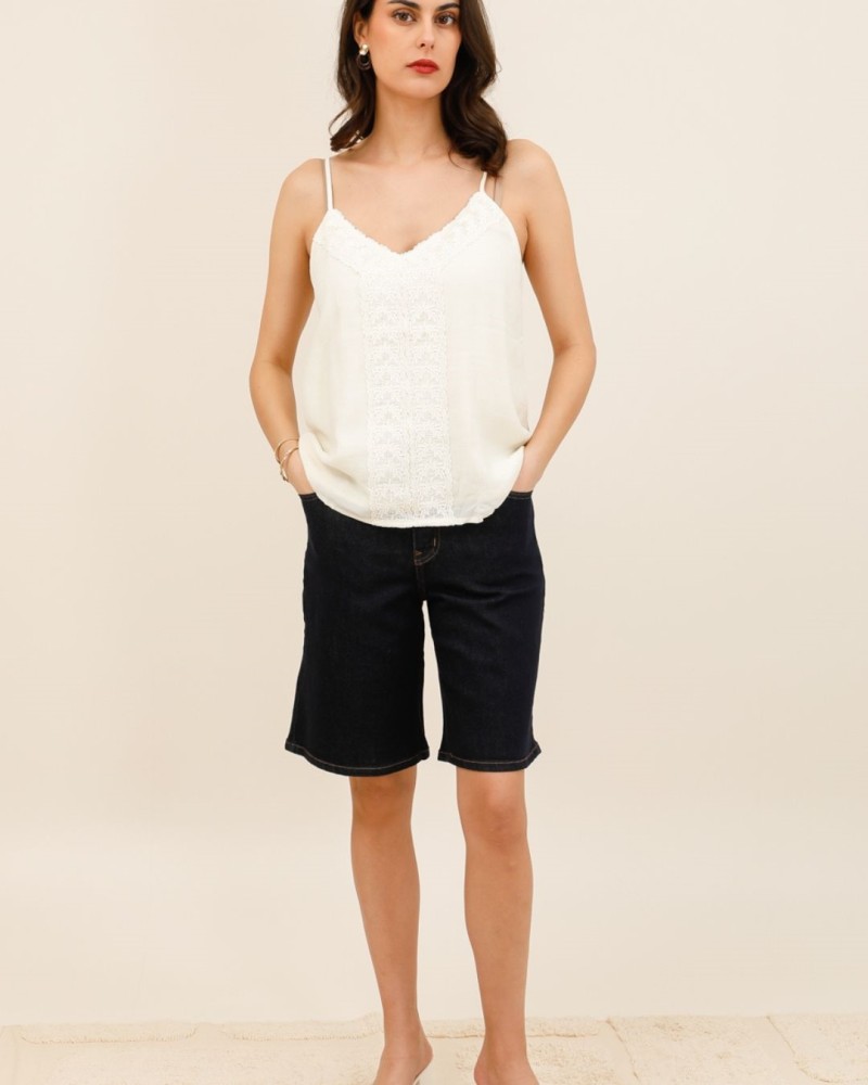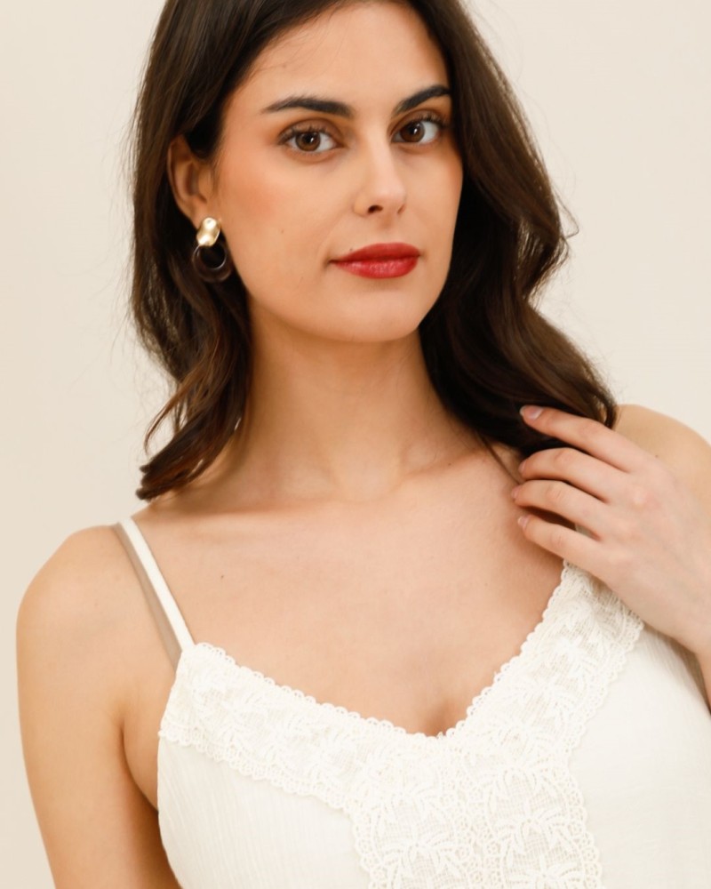 Son encolure délicatement ornée de dentelle apporte une note féminine et sophistiquée, tout en sublimant le décolleté avec subtilité. Les fines bretelles réglables assurent un ajustement parfait et un maintien optimal.