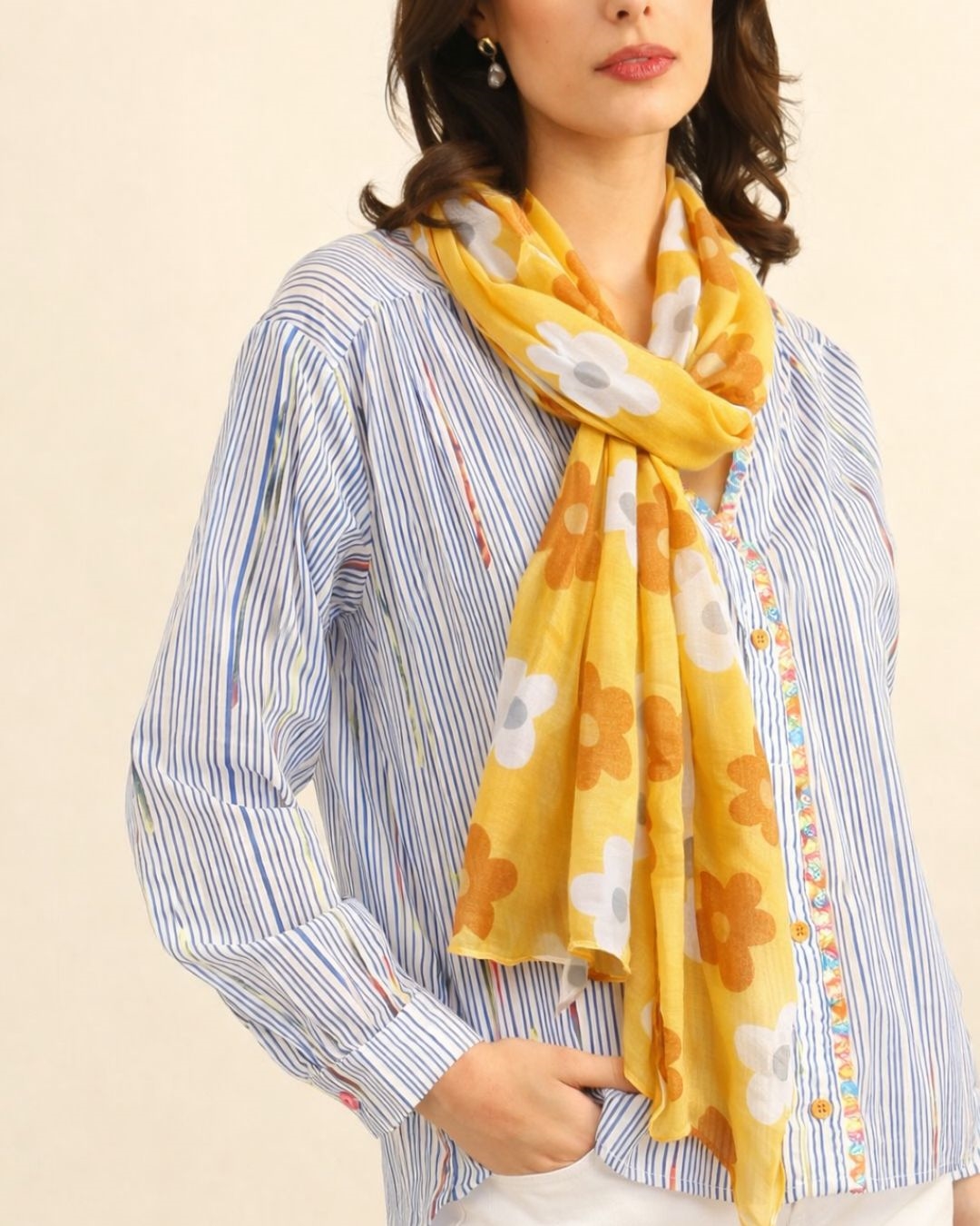 Le foulard Fleurs Lumineuses Multicolore apporte une touche joyeuse et éclatante à votre tenue grâce à son imprimé floral stylisé et ses couleurs lumineuses. Léger et fluide, il offre un confort optimal tout au long de la journée et se drape avec élégance autour du cou. Disponible en plusieurs coloris, il s’adapte à toutes les envies et styles, du plus casual au plus sophistiqué. Sa grande dimension permet de le porter de différentes façons : noué, en étole ou simplement posé pour un look frais et féminin.