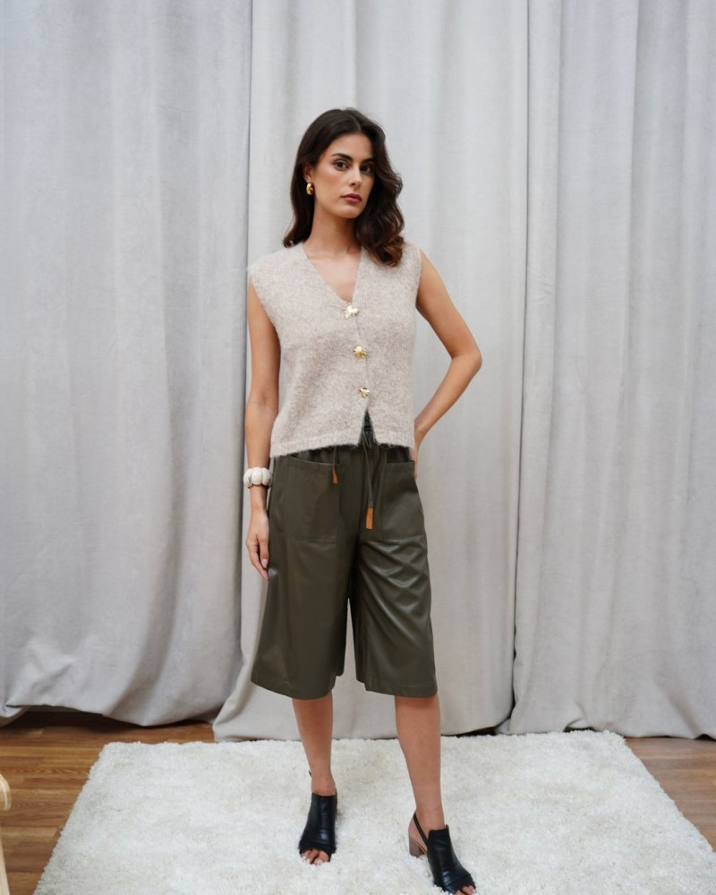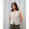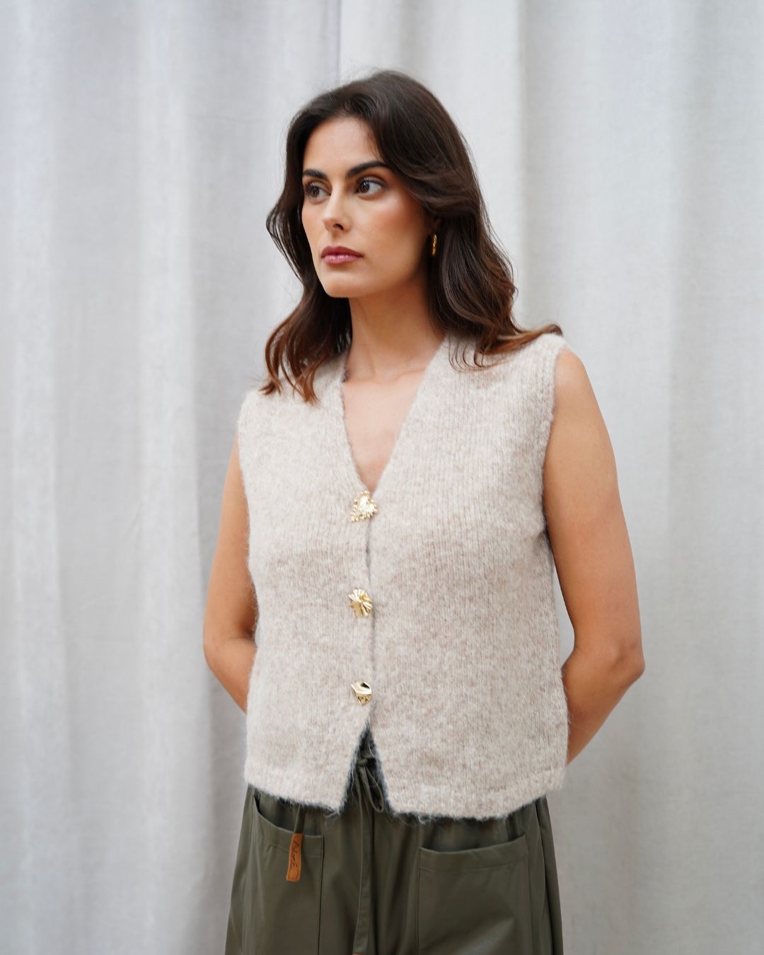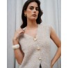 Le gilet Gina est la pièce cocooning chic qui réinvente vos looks de saison. Confectionné dans une maille moelleuse et agréable, il se distingue par ses jolis boutons dorés au design raffiné qui ajoutent une touche élégante et féminine. Sans manches, il se porte aussi bien sur un top basique qu’une chemise, pour un style à la fois moderne et décontracté. Disponible en taupe et en couleur café, le gilet Gina s’adapte facilement à toutes vos envies et devient un incontournable à superposer dans votre dressing.