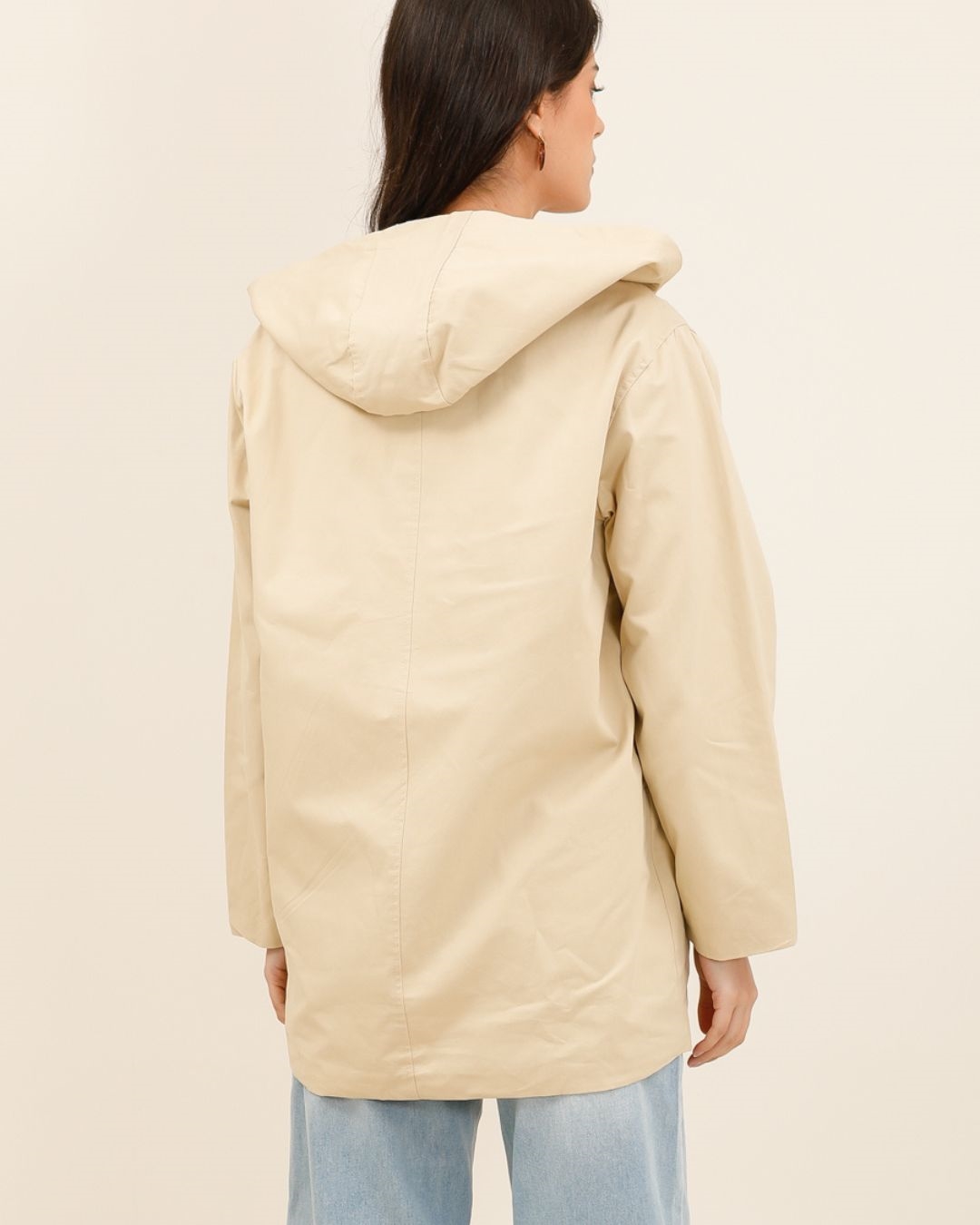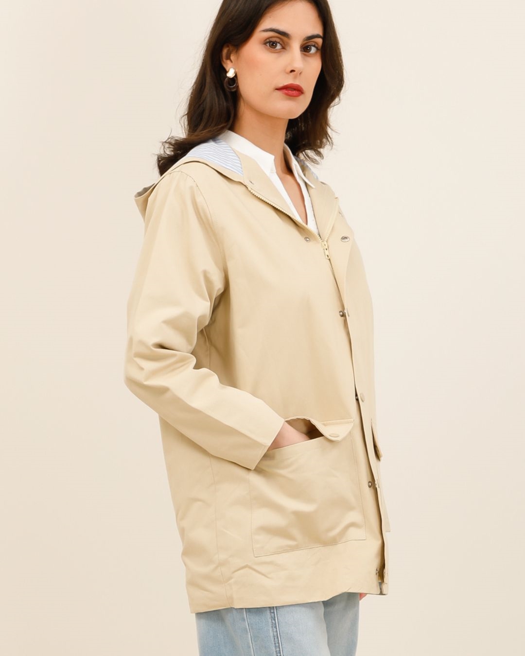 On apprécie particulièrement ses détails soignés : fermeture zippée et boutonnée, grandes poches plaquées et doublure à fines rayures visibles dans la capuche pour une note élégante et contemporaine.