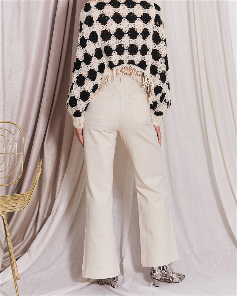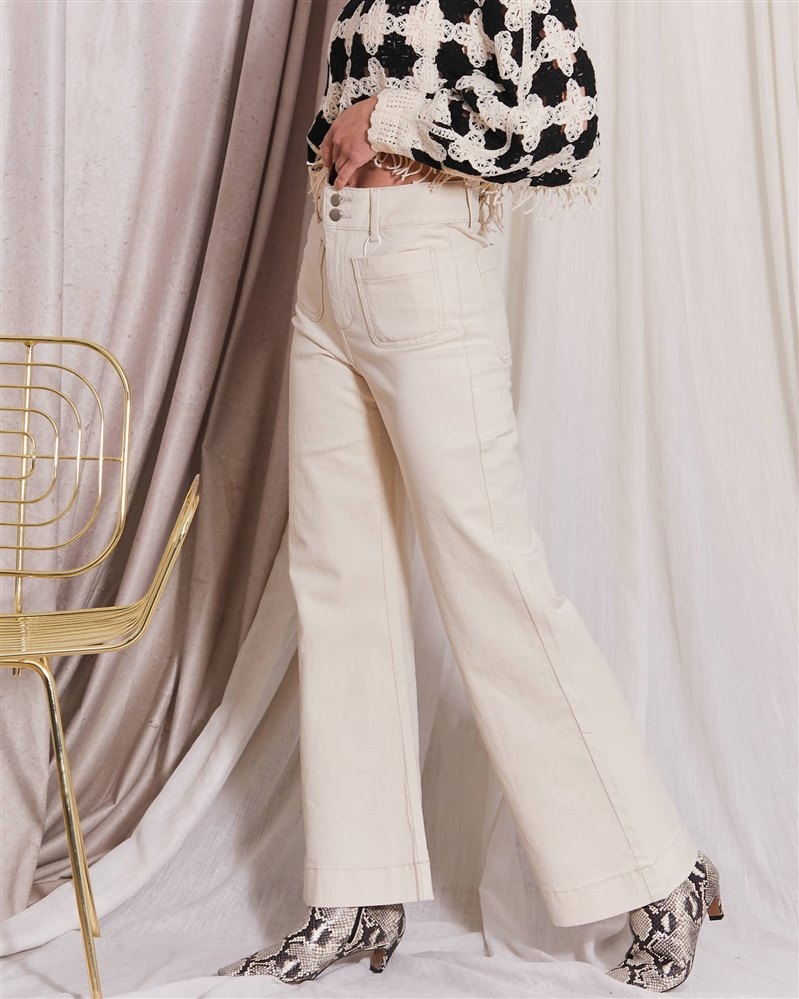 e pantalon Elenette d’Oraije revisite le jean blanc classique avec une touche rétro chic. Sa coupe droite légèrement évasée en bas, ses poches plaquées devant et ses boutons dorés apportent une allure élégante et tendance. Ce modèle est parfait pour illuminer vos looks de saison, facile à associer avec une chemise colorée, un t-shirt graphique ou une blouse fluide.