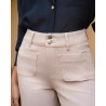 e pantalon Elenette d’Oraije revisite le jean blanc classique avec une touche rétro chic. Sa coupe droite légèrement évasée en bas, ses poches plaquées devant et ses boutons dorés apportent une allure élégante et tendance. Ce modèle est parfait pour illuminer vos looks de saison, facile à associer avec une chemise colorée, un t-shirt graphique ou une blouse fluide.