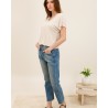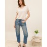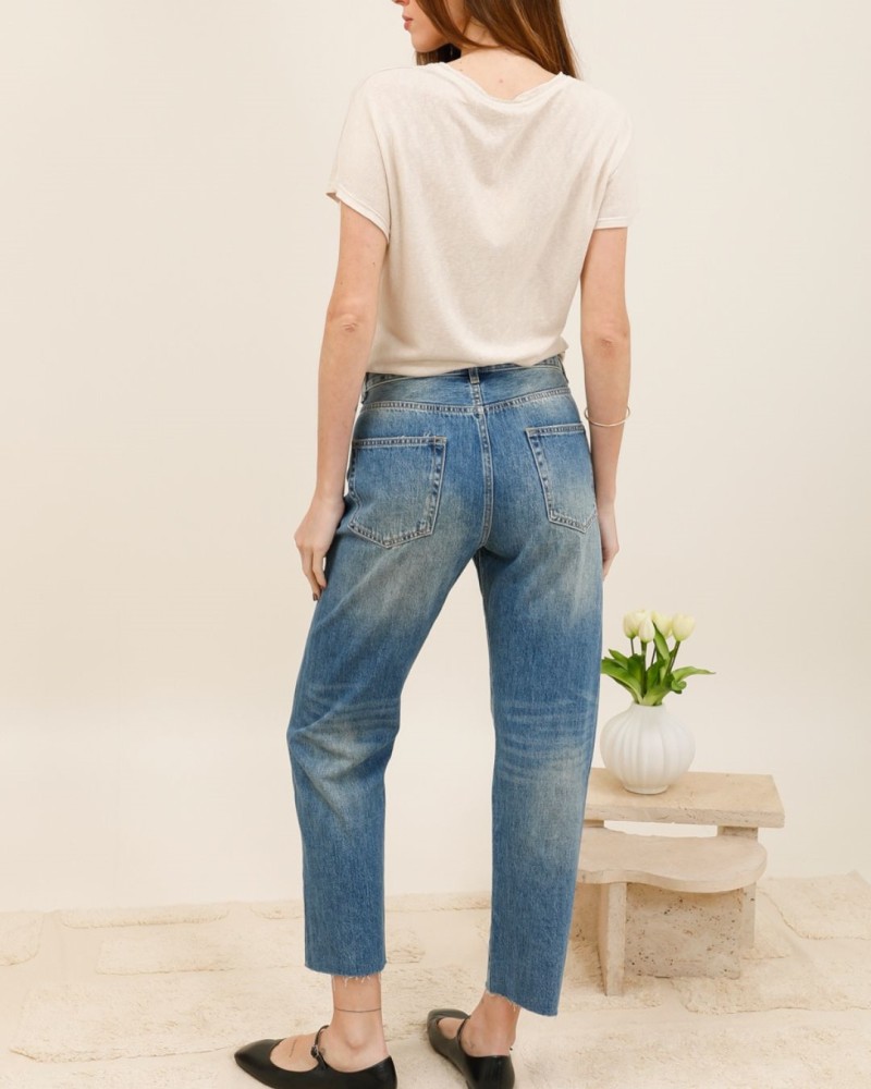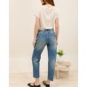 Confectionné dans un denim légèrement délavé, il offre un look vintage parfaitement dans l’air du temps. Sa coupe droite assure confort et polyvalence, idéale pour un style casual chic au quotidien.