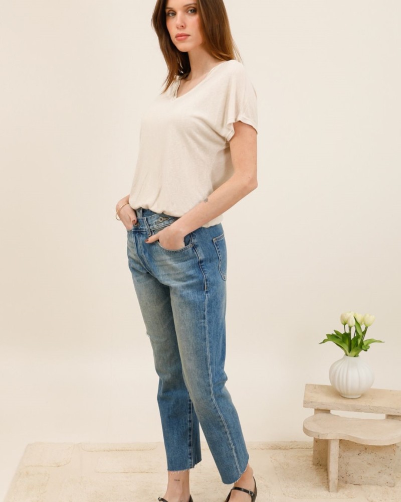 Le jean Girbot revisite le denim classique avec une touche audacieuse et moderne. Sa particularité ? Une taille croisée asymétrique qui apporte du caractère et une silhouette subtilement structurée.