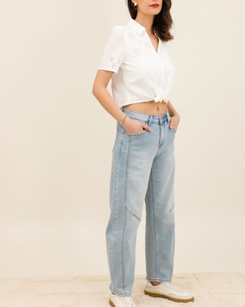 Son denim bleu clair délicatement délavé illumine la tenue et s’associe facilement à toutes les pièces du dressing. Les surpiqûres et empiècements au niveau des jambes apportent du caractère et une allure contemporaine.