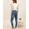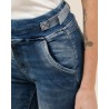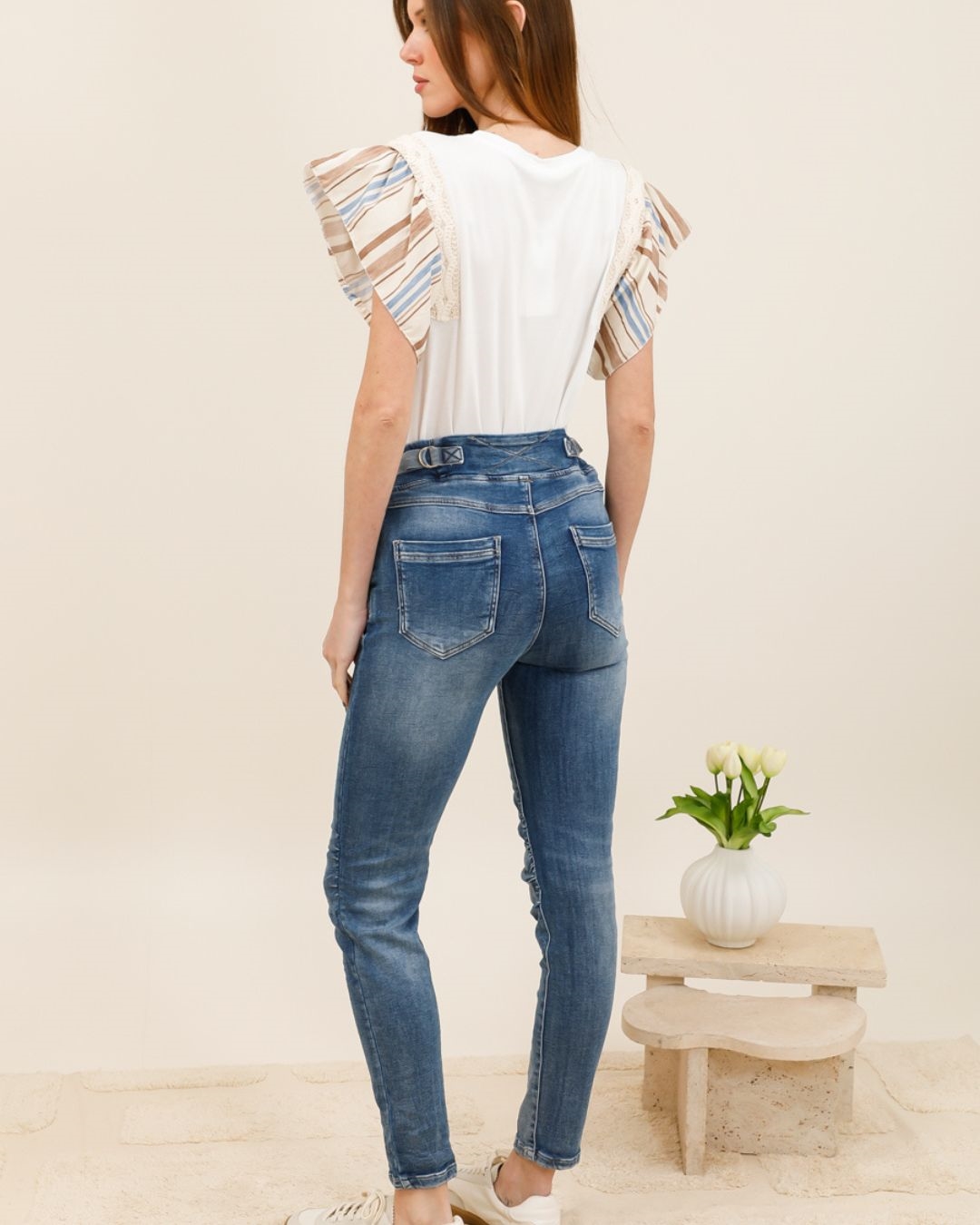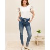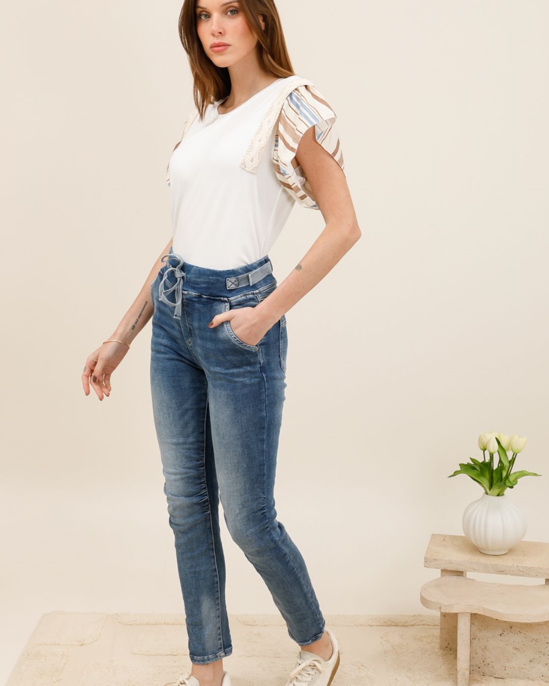 Le jeans Léna revisite le denim avec une approche moderne et confortable. Grâce à sa taille élastiquée avec lien à nouer, il offre un ajustement parfait tout en gardant un esprit casual très tendance.