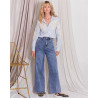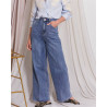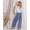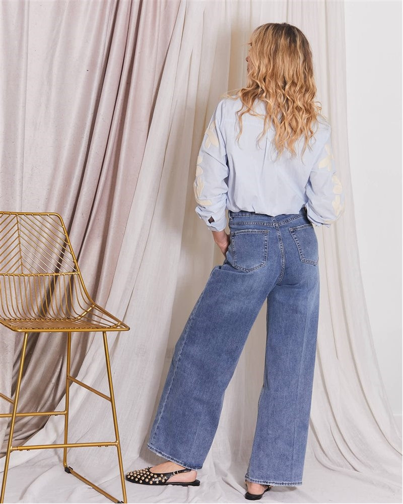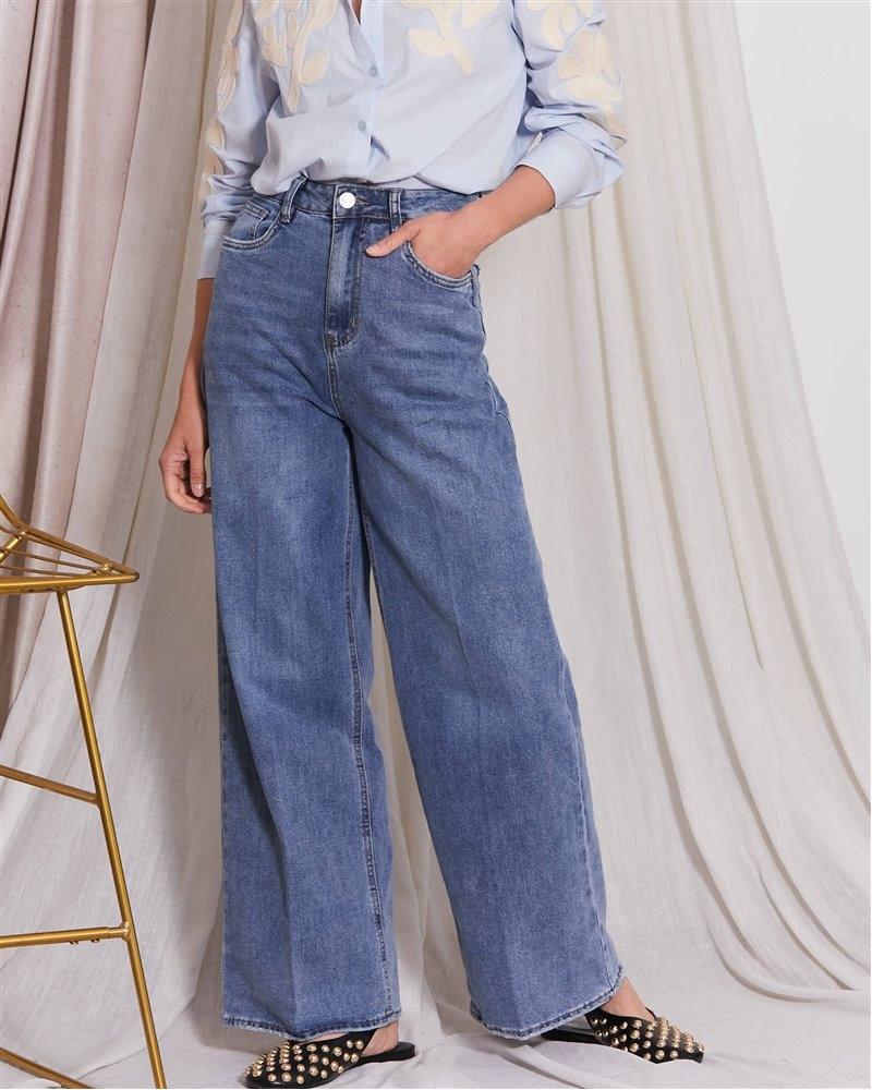 Confectionné en denim bleu légèrement délavé, le jean Tide adopte une coupe large et droite de type wide leg pour un look à la fois tendance et décontracté. Sa taille haute structure la silhouette, tandis que la fermeture classique par bouton et zip assure confort et maintien. Un essentiel au style vintage subtil, parfait pour des tenues du quotidien avec une touche mode.