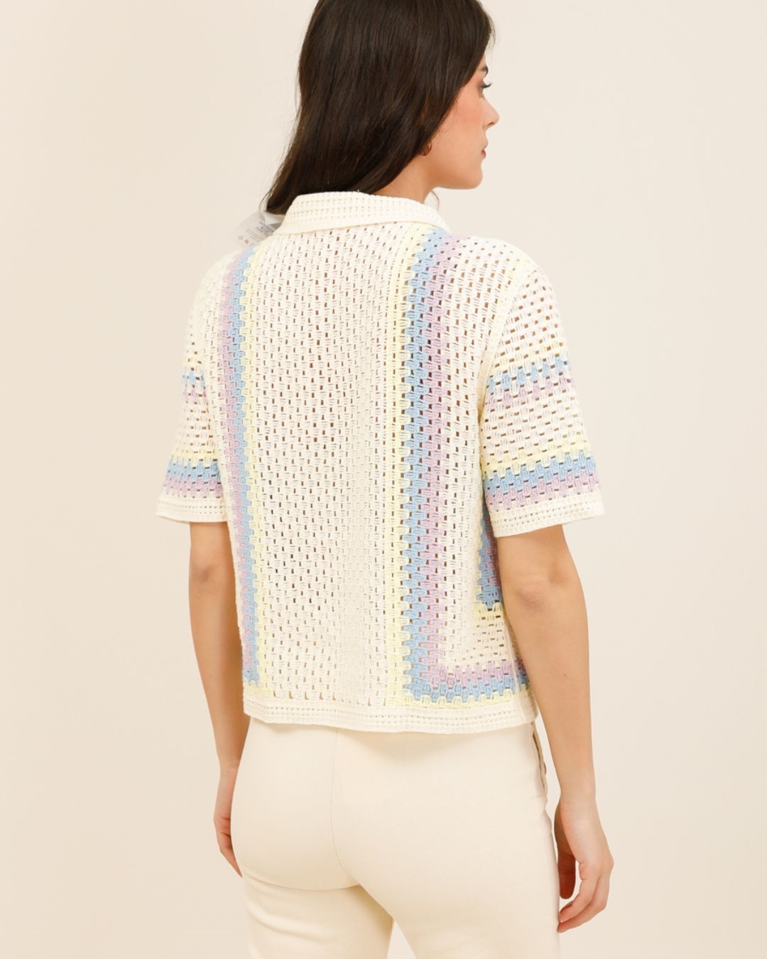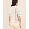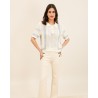 Doté de manches courtes et d’un col polo boutonné, il allie confort et élégance avec subtilité. Sa coupe droite et légèrement ample convient à toutes les silhouettes et se porte facilement avec un pantalon clair ou un jean pour un look frais et féminin.