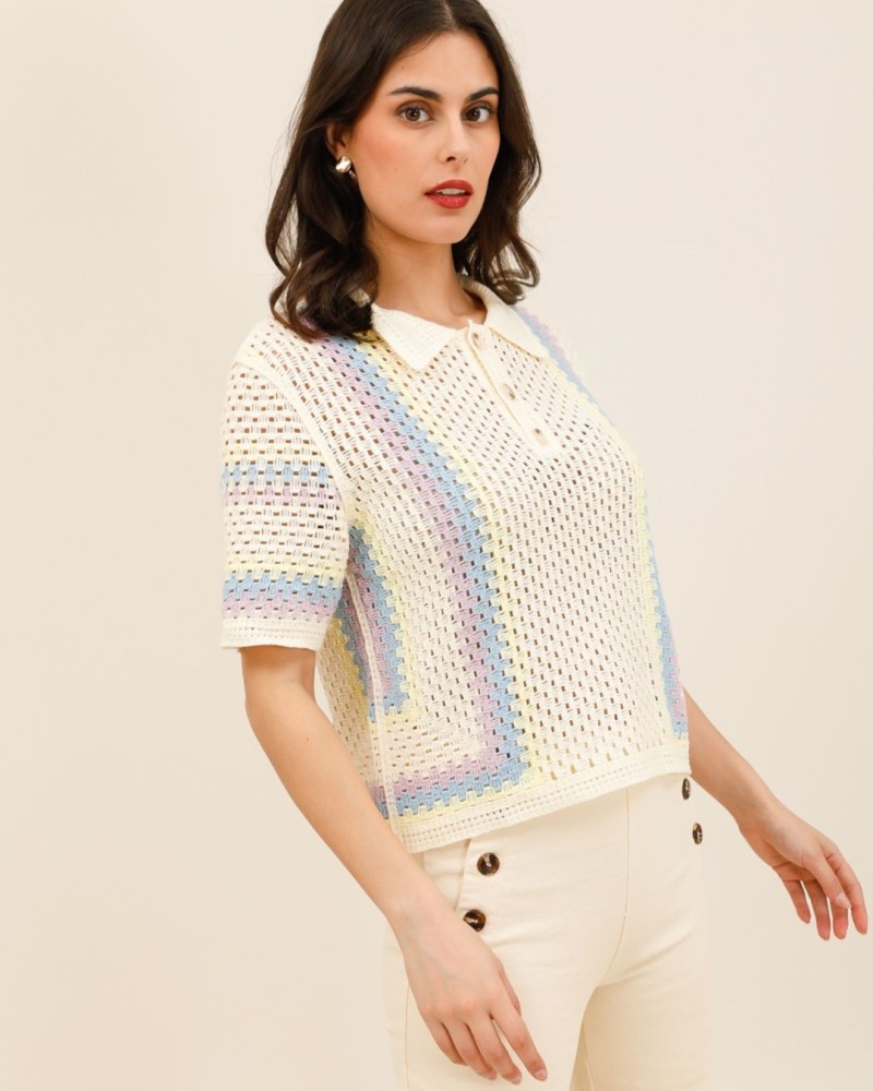Le pull Angèle séduit par son style unique et lumineux. Confectionné en maille ajourée, il apporte une touche de légèreté et de modernité à votre tenue. Ses détails crochetés aux motifs graphiques et colorés (rose, orange, jaune ou tons pastel) lui donnent un esprit bohème chic très tendance.