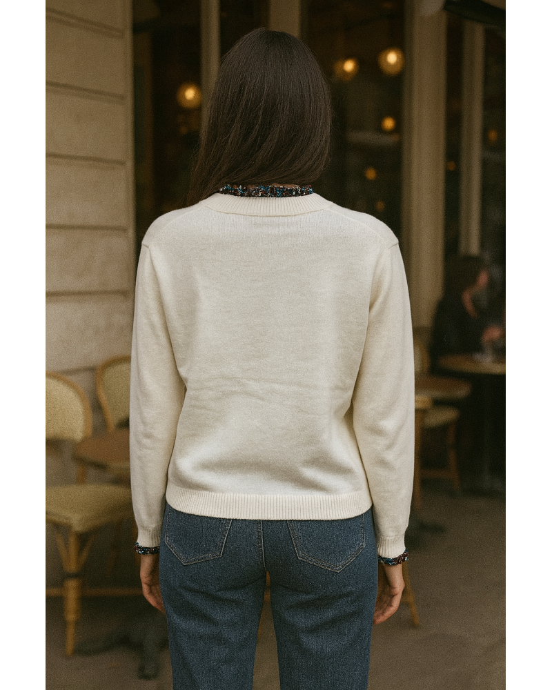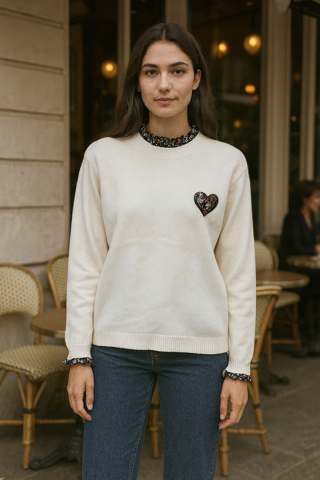Le pull Kiria incarne la douceur et la féminité avec une touche de fantaisie. Sa maille fine et confortable est rehaussée d’un joli cœur fleuri brodé sur la poitrine, apportant une note délicate et poétique. Les finitions fleuries au col et aux poignets ajoutent un charme rétro irrésistible. Disponible en café et beige, ce pull se marie parfaitement avec un jean, une jupe ou un pantalon en velours pour un look élégant et cosy.