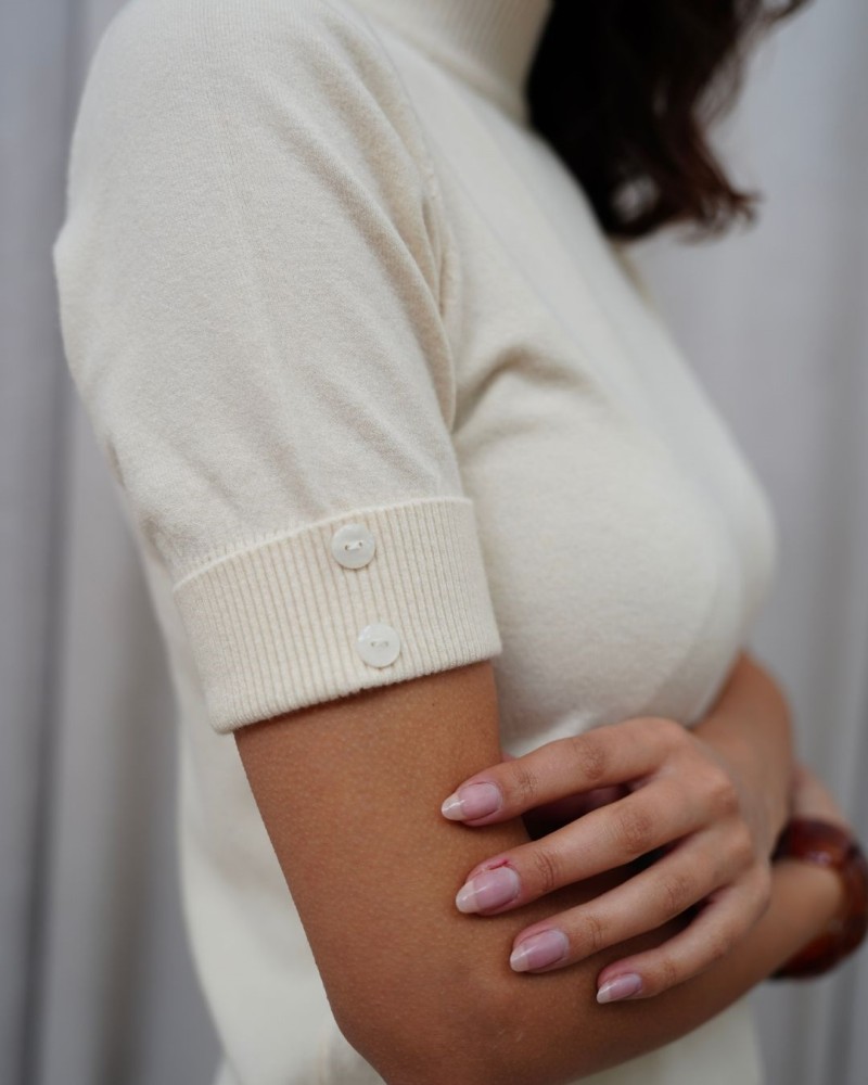 Avec son col montant et ses jolis détails de boutons sur les manches, il allie simplicité et raffinement. Sa maille douce et confortable s’adapte à toutes les saisons, se porte aussi bien seule qu’en superposition.