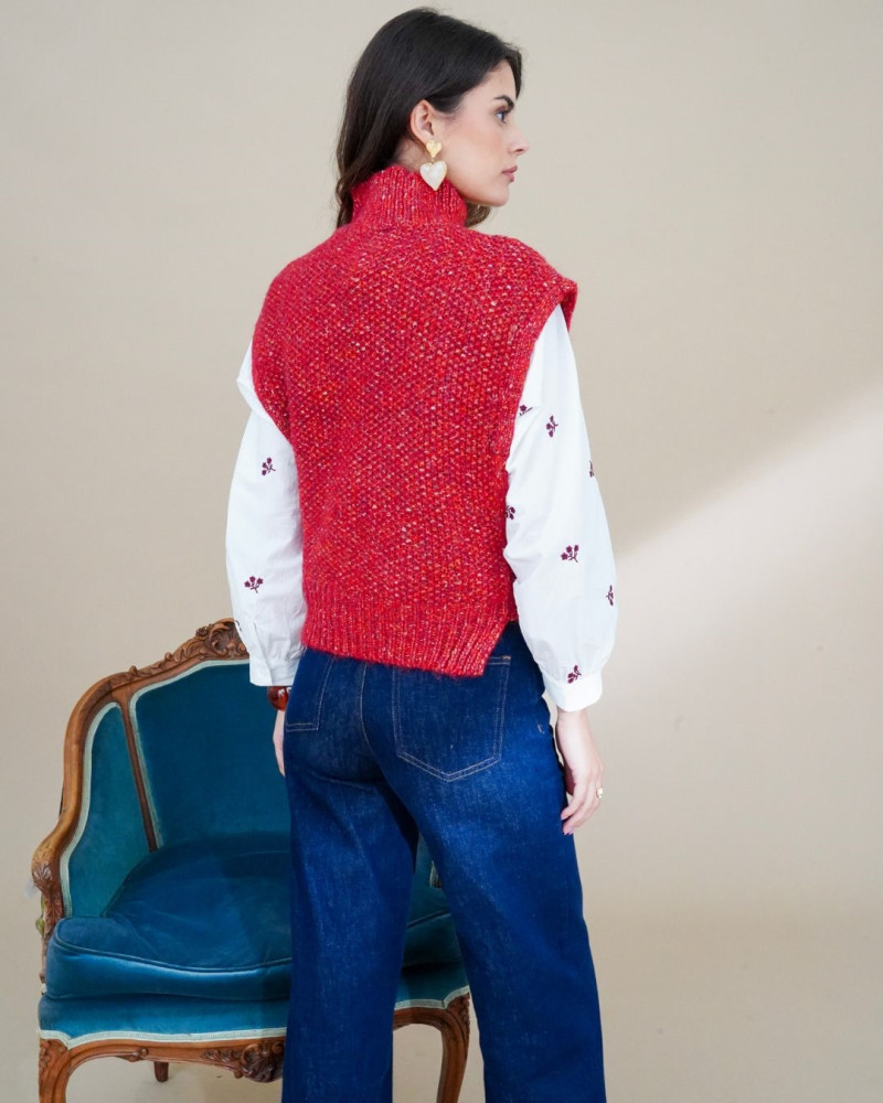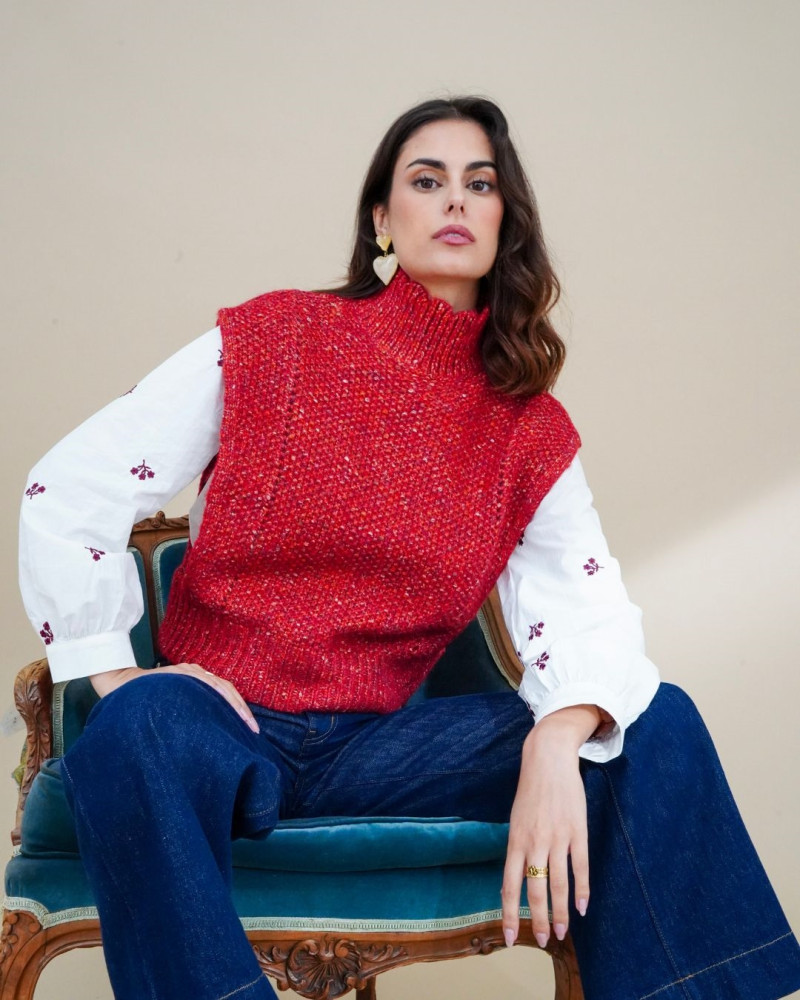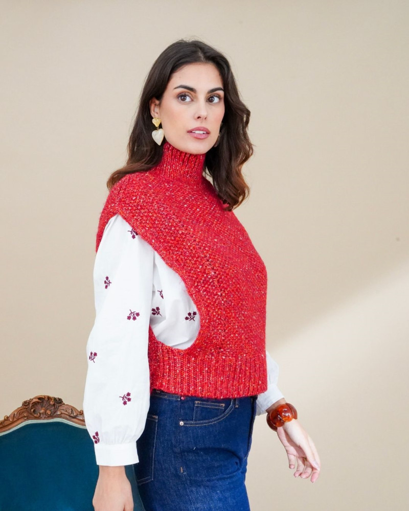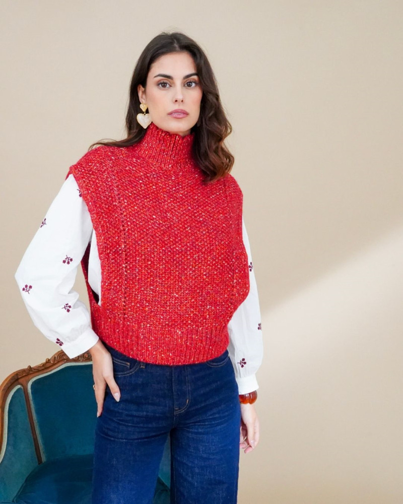 Le Sonia Pull est un modèle sans manches au col montant qui allie confort et style. Tricoté dans une maille texturée, il se décline en deux coloris tendance : rouge éclatant et chocolat profond. Facile à superposer sur une chemise, un col roulé ou un simple t-shirt, il apporte une touche moderne et chaleureuse à vos looks d’hiver comme de mi-saison. Un essentiel chic et décontracté qui s’adapte aussi bien à vos journées en ville qu’à vos moments cocooning.