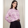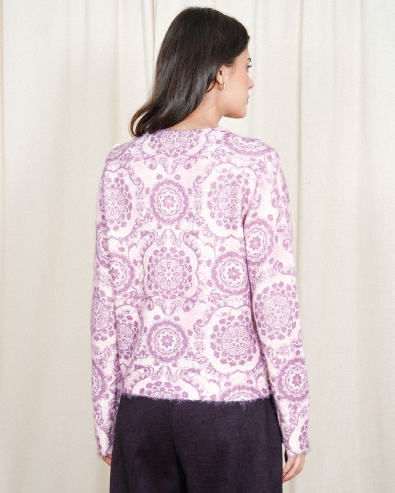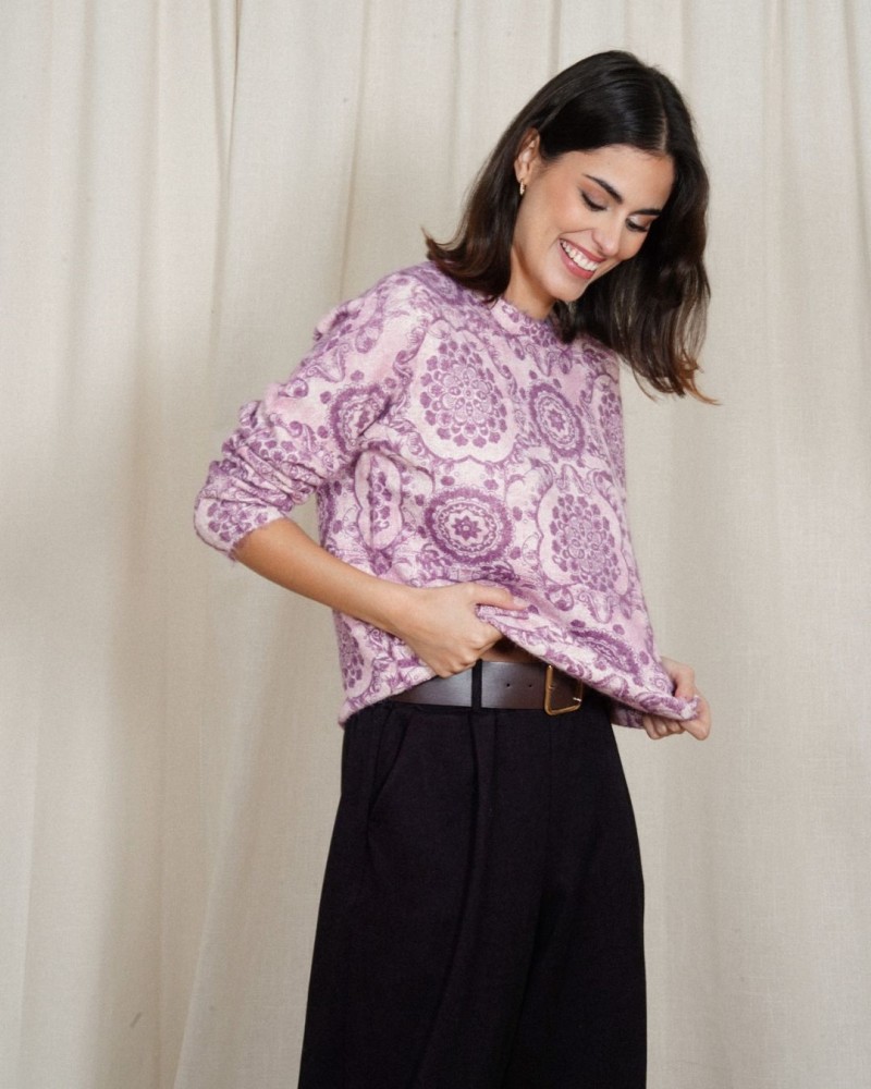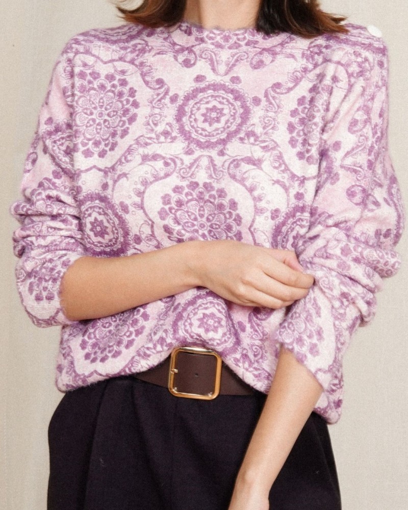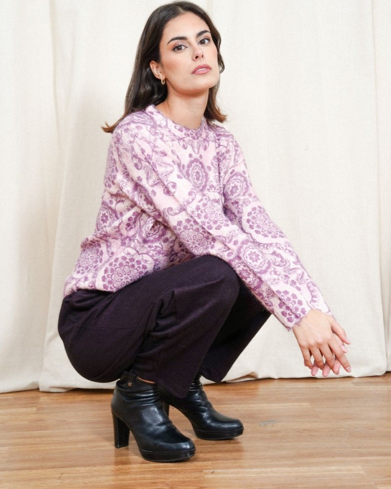 Le pull Yuma se distingue par son imprimé délicat à motifs floraux et arabesques, apportant une touche bohème chic à votre garde-robe d’hiver.
