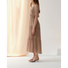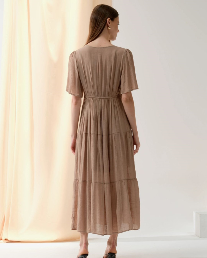 Son encolure cache-cœur subtilement plongeante sublime le décolleté tout en restant élégante. La taille marquée affine la silhouette tandis que la jupe longue à volants apporte un mouvement gracieux à chaque pas.