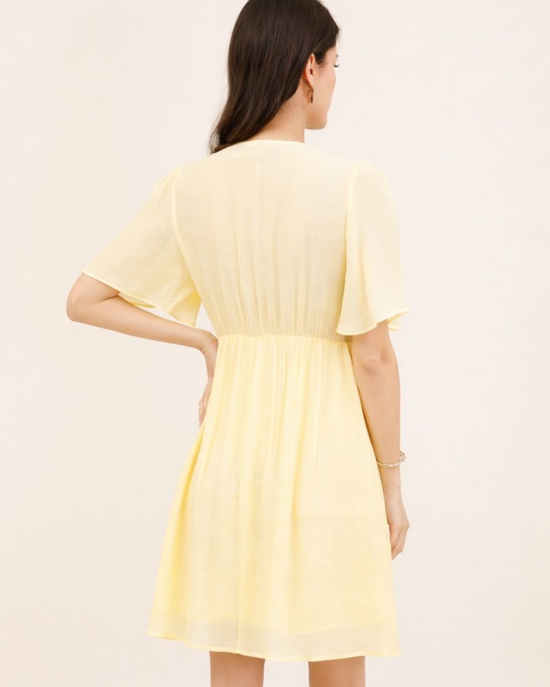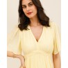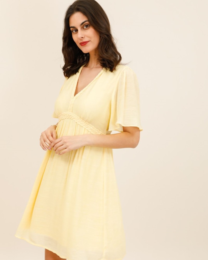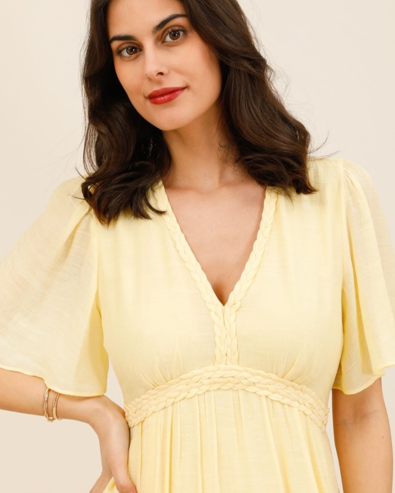 Dotée d’un joli décolleté en V orné d’un détail tressé, elle apporte une touche féminine et raffinée. Sa taille empire souligne subtilement la poitrine avant de s’évaser en une jupe légère, créant un tombé naturel et flatteur.
